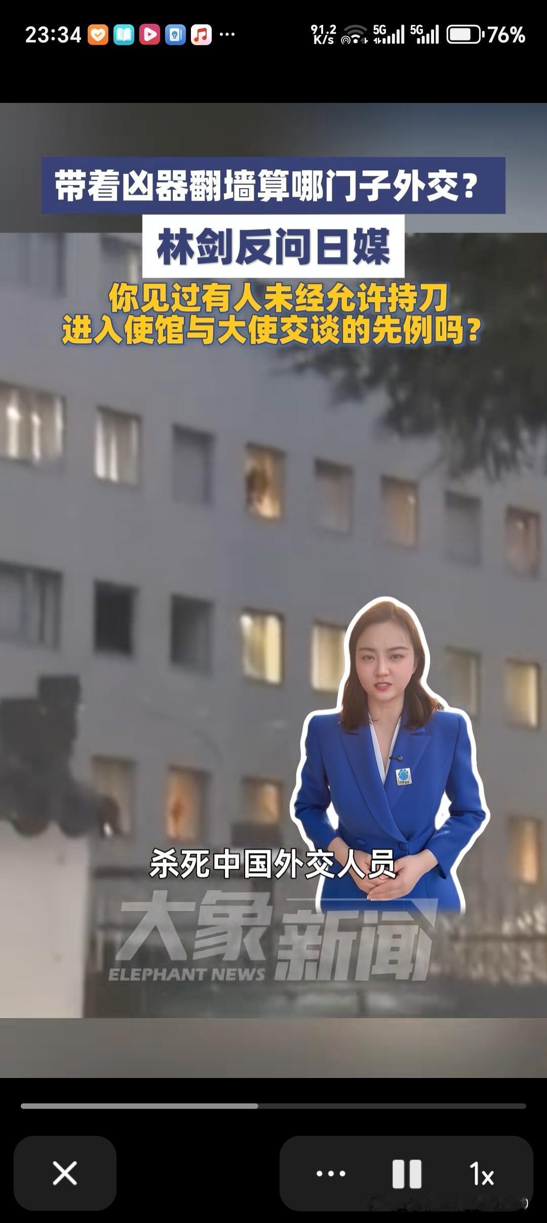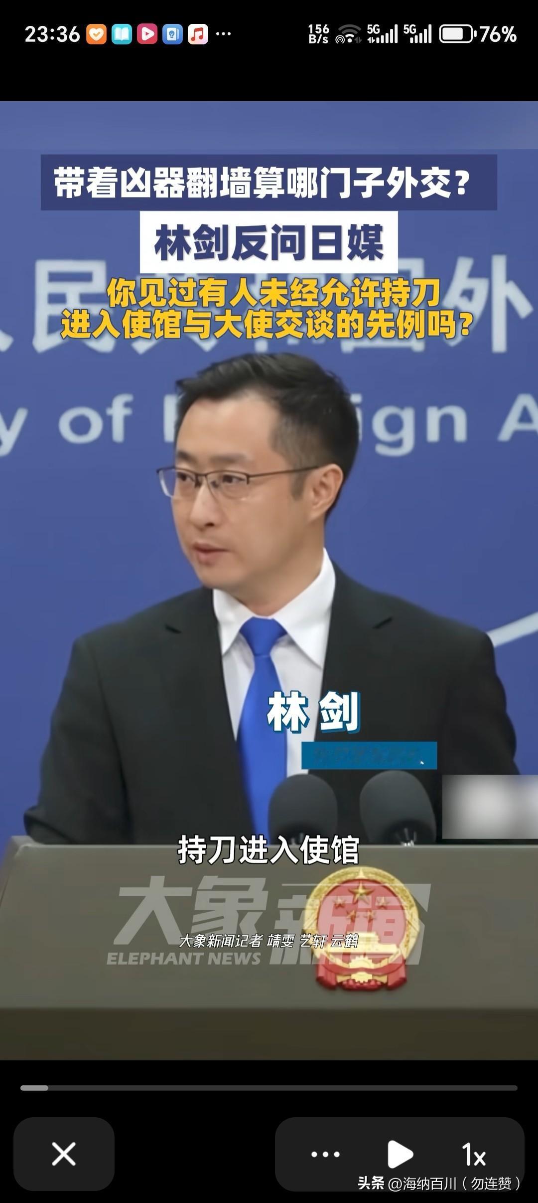 一个现役军官持刀翻墙进入我使馆是什么性质?大使馆是我国海外领土,神圣不可侵犯,未经允许私自进入,而且是持械进入且行为恶劣,这相当于入侵,应有理由击bi!给小日子点颜色看看。