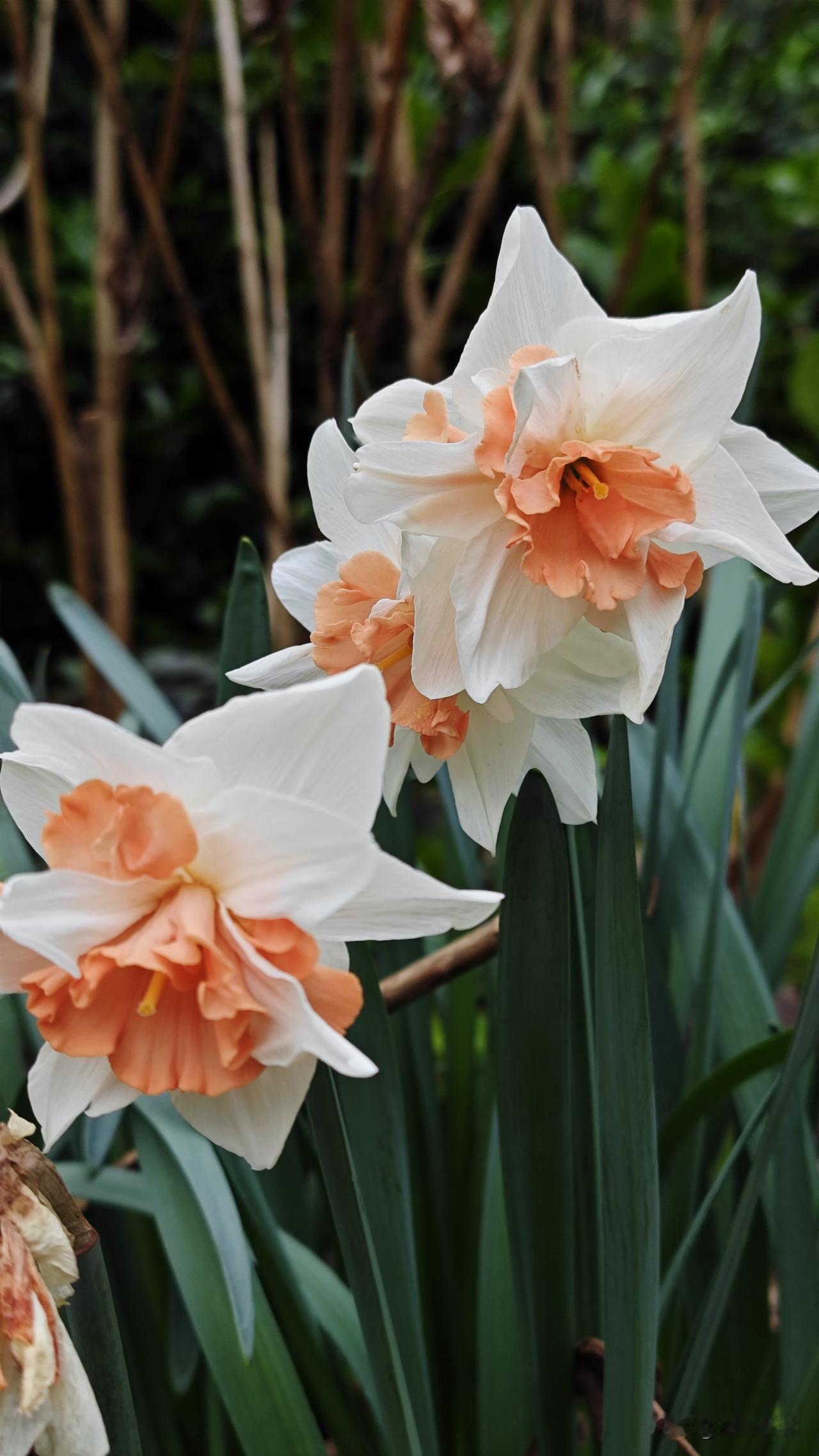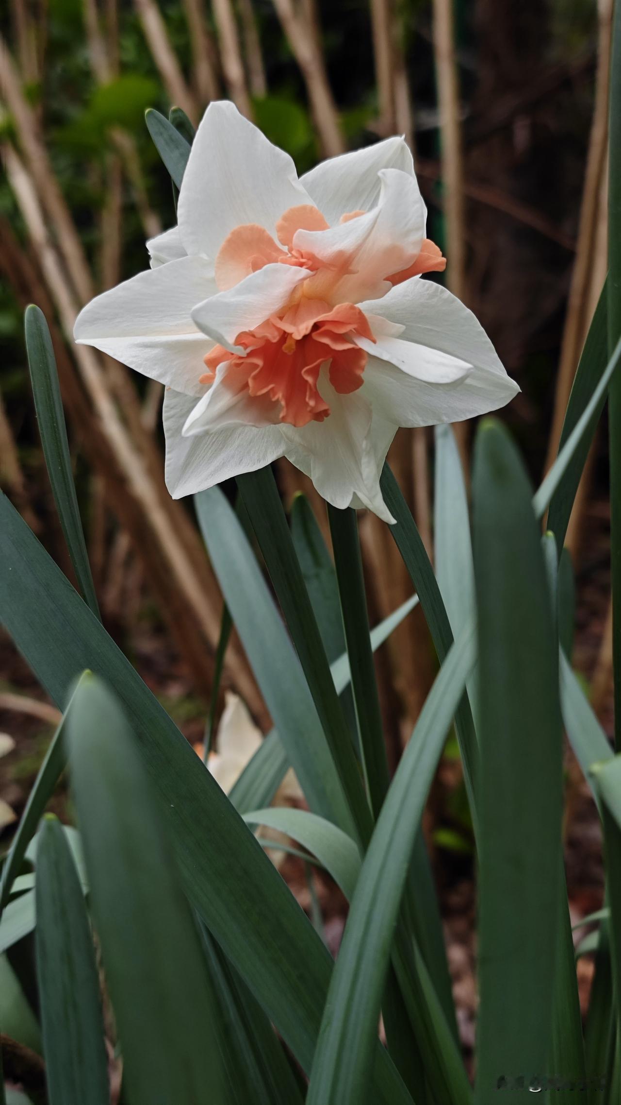 重瓣水仙花,也被称为洋水仙。它拥有洁白如玉的外层花瓣,中心是层层叠叠、如裙摆般卷曲的橙粉色副冠,形态优雅,色彩温柔,既有东方水墨的清雅,又有西洋油画的饱满。
