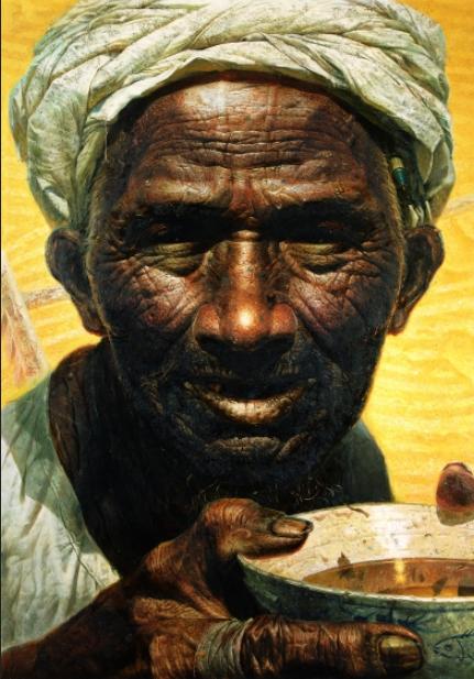 展览现场,观众从四面八方涌来,在画前排起长队,久久驻足凝视,画中的老农,头裹陈旧白头巾,古铜色的脸上沟壑纵横,像黄土高原的沟壑,浑浊的眼神里满是疲惫与茫然,却又透着土地般的坚韧,双手捧着缺口的旧瓷碗,碗里盛着浑浊的水。