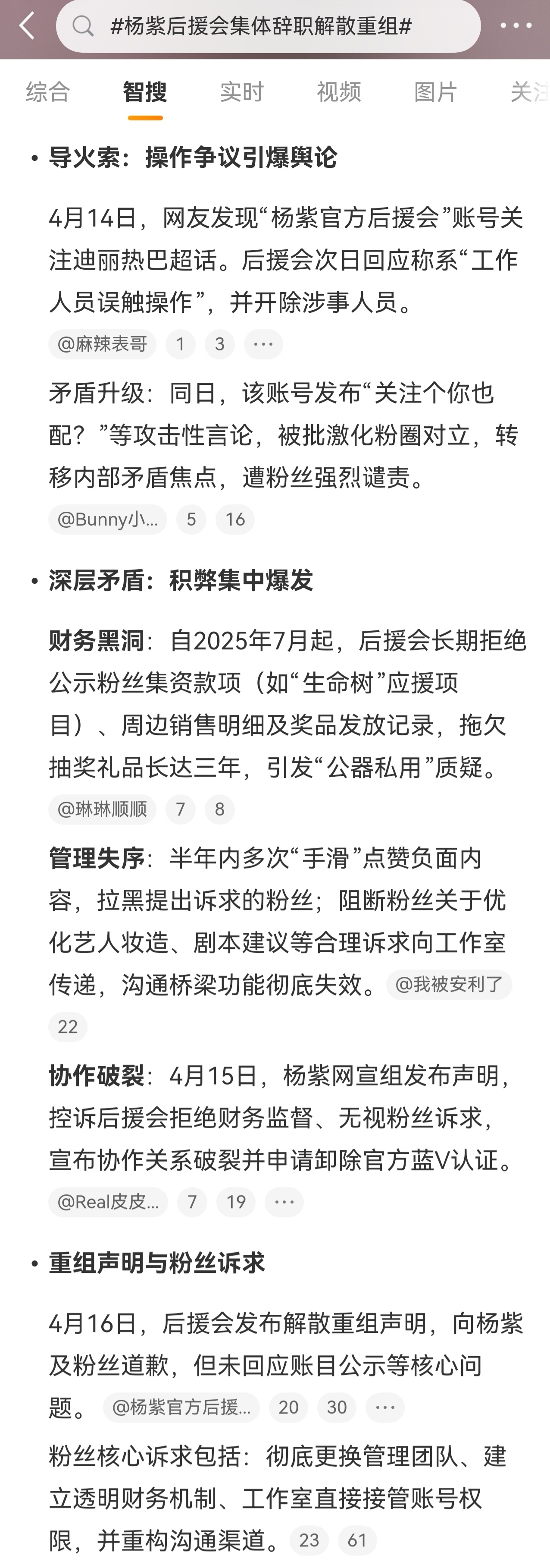 撕❶杨紫粉要求后援会公示🍊项目跟周边,抽奖品不发等问题,后上了个多年前的热搜后援会手滑关注过迪丽热巴超话,发文回应手滑并讽刺开撕8,回应已开除手滑人员,重组后援会,被指转移矛盾,网宣组发文跟后援会协作关系破裂 图8后援会暂停运营,后续将有序开启招新重组工作 图9❷朱志鑫粉控诉时代峰峻拒绝配合奢侈珠宝品牌宝曼兰朵的宣发需求,品牌方只能去找站姐要图 图10❸月鳞绮纪,角色歌曲片段,鞠婧祎粉丝维权,露芜衣个人角色曲没有标原唱,还有男声 图11田嘉瑞粉丝辟谣,并非田嘉瑞本人唱的 图12❹鹤男的粉丝脱粉了,说鹤男年龄造假、区别对待新粉和老粉、甚至私联大粉同游迪士尼 图人13