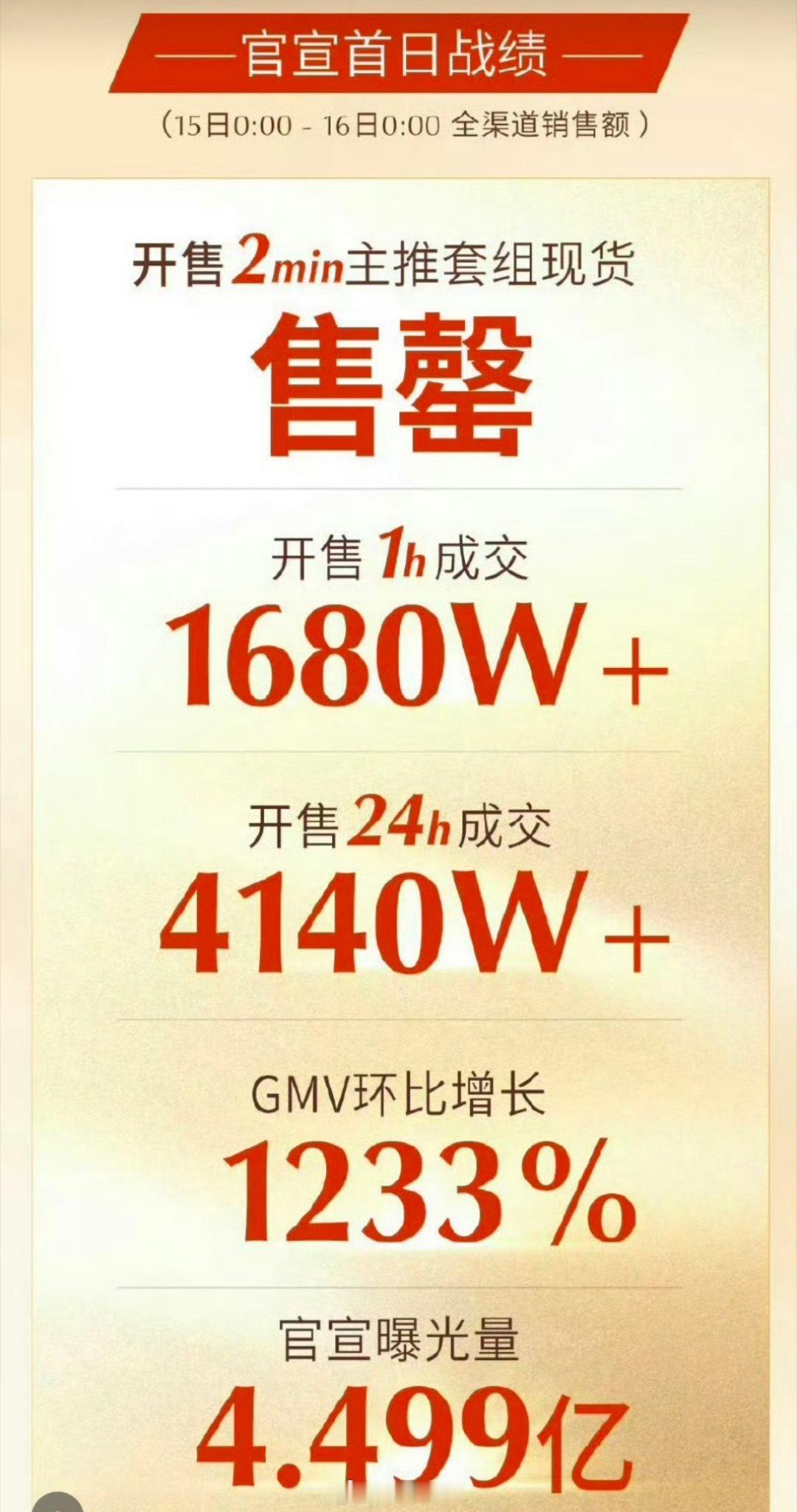 开售2分钟主推套组现货秒空,1小时全渠道成交破1680W+,截止16日零点实际不