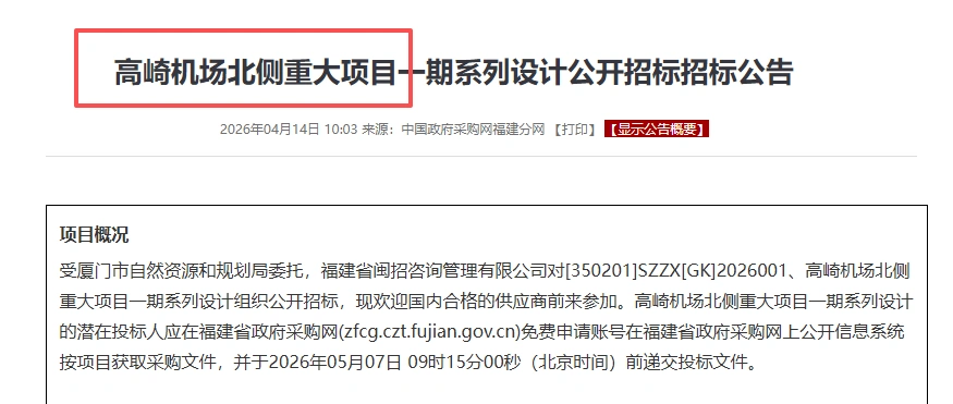 日前,厦门市资规局正式启动《高崎机场北侧重大项目一期系列设计》公开招标,预算645万元。
