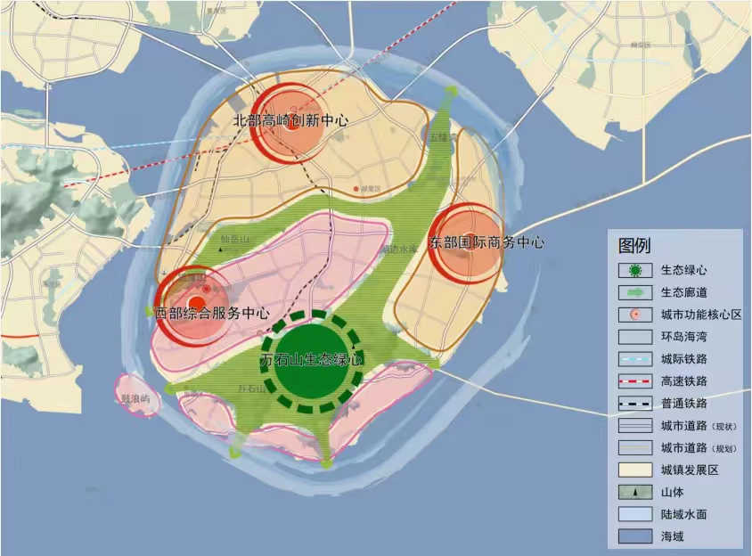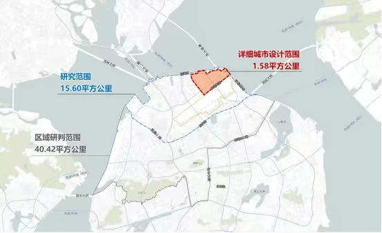 核心设计范围:1.58平方公里(环岛干道、花屿东路、高崎道围合区域)
