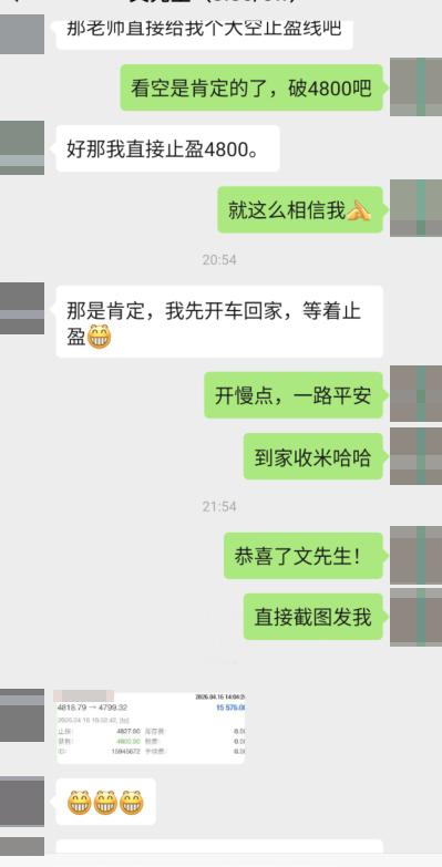 同步一下实盘文先生的操作:4818空单直接跟,义无反顾等止盈,这就是被信任的感觉,所幸不辱使命,最终4800止盈还是等来了。不信的人入不了场,摇摆不定中途跳车的人吃到几十点,坚定到最后的人吃完一百八十点。交易场上就是如此残酷,你要得到什么就得付出什么,想要更高的回报就要付出更大的筹码,承担更重的风险。实盘中的学员均已全部安全离场,吃到的利润也都十分可观。我们都懂一直在观望的人是不会有半点风险的,但同样什么也不会得到。黄金金价