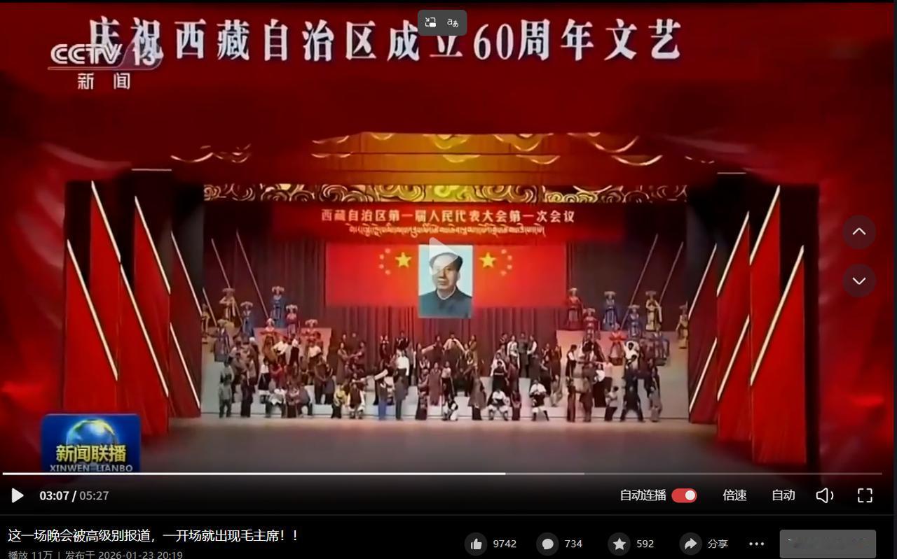 ,由中央电视台报道,庆祝西藏自治区成立六十周年文艺晚会,舞台正前方悬挂的是毛主席像!