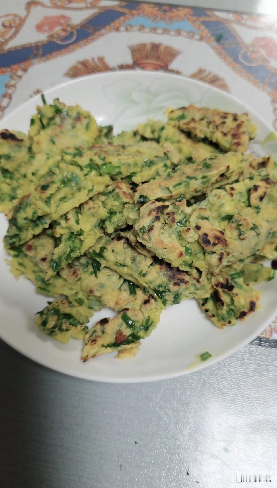 终于把面和好,倒入切好的韭菜,然后上锅煎。前前后后10分钟,大功告成。