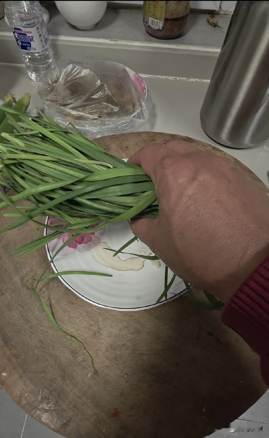 晚饭本来不想吃了。但忽然看到厨房里昨天上午割的韭菜,再不吃就蔫儿了。它们在我的院子里生长不易,浪费实在可惜,所以就想动了动我愚笨的脑子,想把它们吃掉。想了半天,韭菜炒鸡蛋,又忽然突发奇想,掺点面粉,煎鸡蛋饼。于是就操作了起来。
