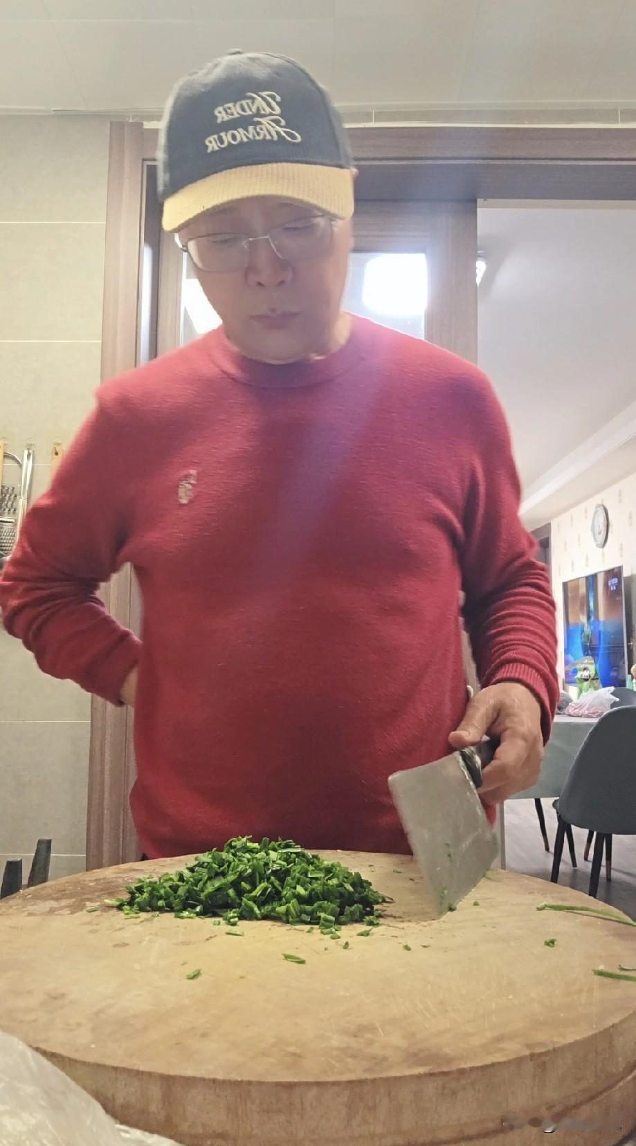 摘韭菜,洗干净,切碎。一小碗面粉倒入一个大碗,磕进3个鸡蛋,搅拌。越搅越黏,越拌越成了一个面蛋。这个时候我意识到流程不对,应该先磕鸡蛋,搅拌均匀后倒入面粉,但是为时已晚,不过已经入了洞房,不好也得说好,不行也得说行,只好硬着头皮拌下去,实在搬不动时加了水,水加多少又加点面,幸好水和面都不缺。