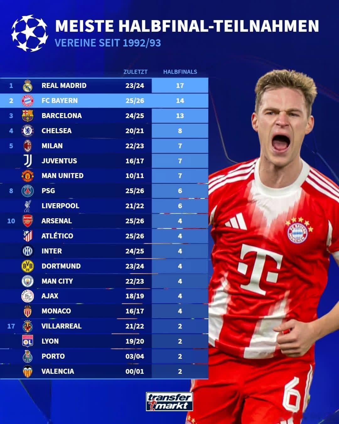 🚨[德國轉會市場網站]:1992-93賽季歐冠聯賽改製之後,拜仁慕尼黑第14次晉級歐冠四強,領先巴塞羅那🇩🇪