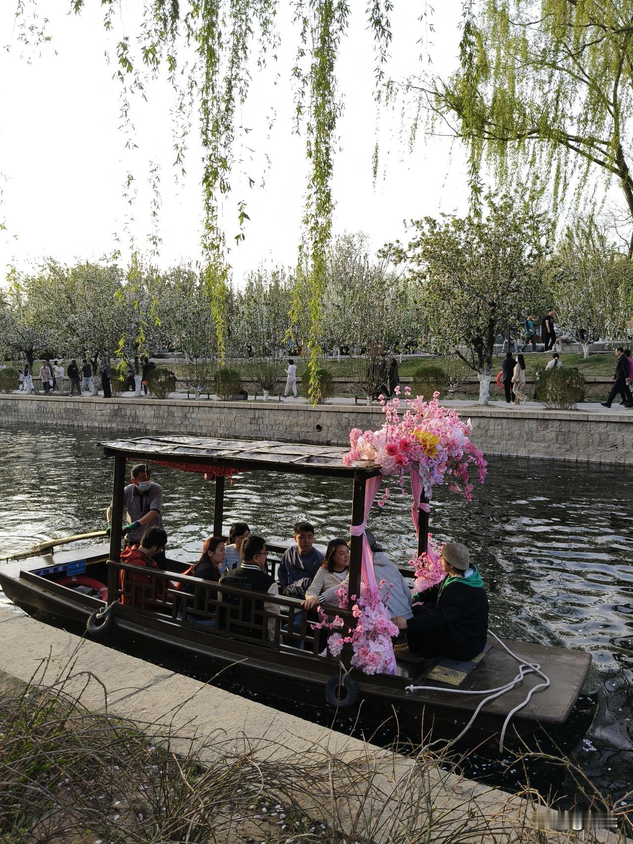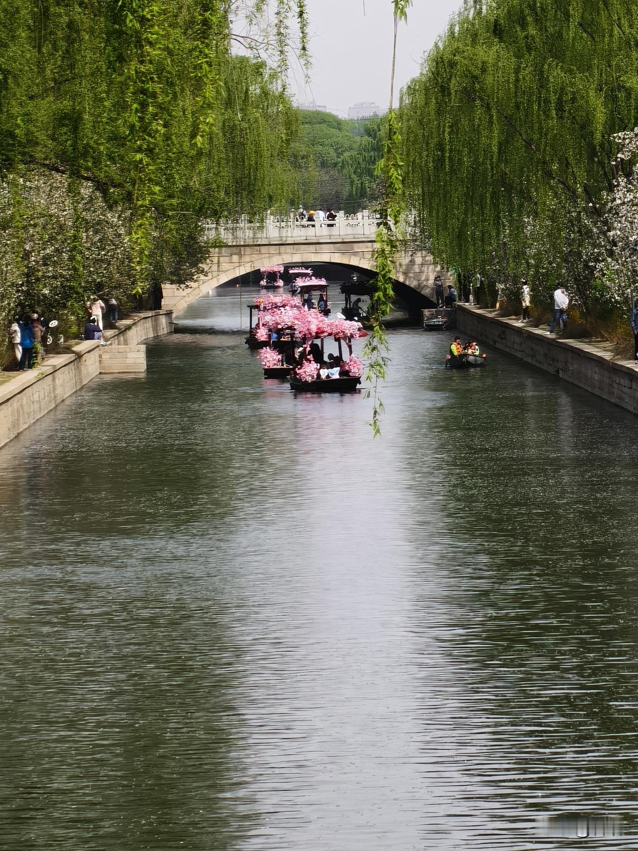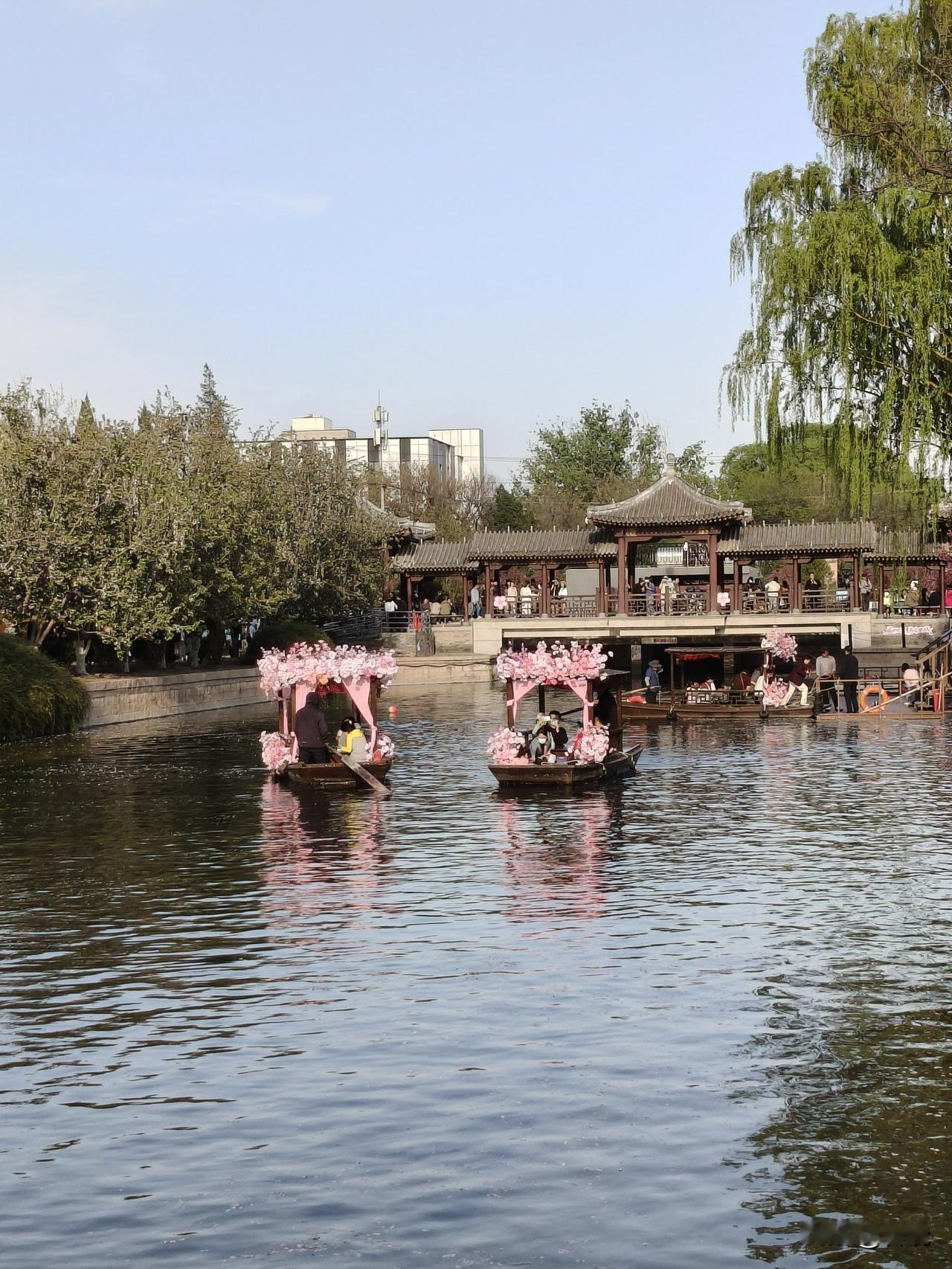 有皮划艇运动爱好者,更多的是游人乘坐的游览花船。