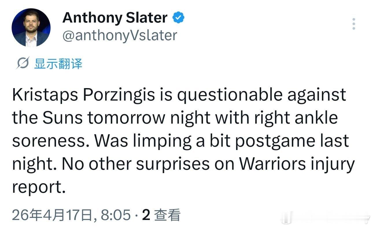 波尔津吉斯明日出战成疑,昨日赛后,他右脚踝缠着绷带,走路有点一瘸一拐。伤病报告中