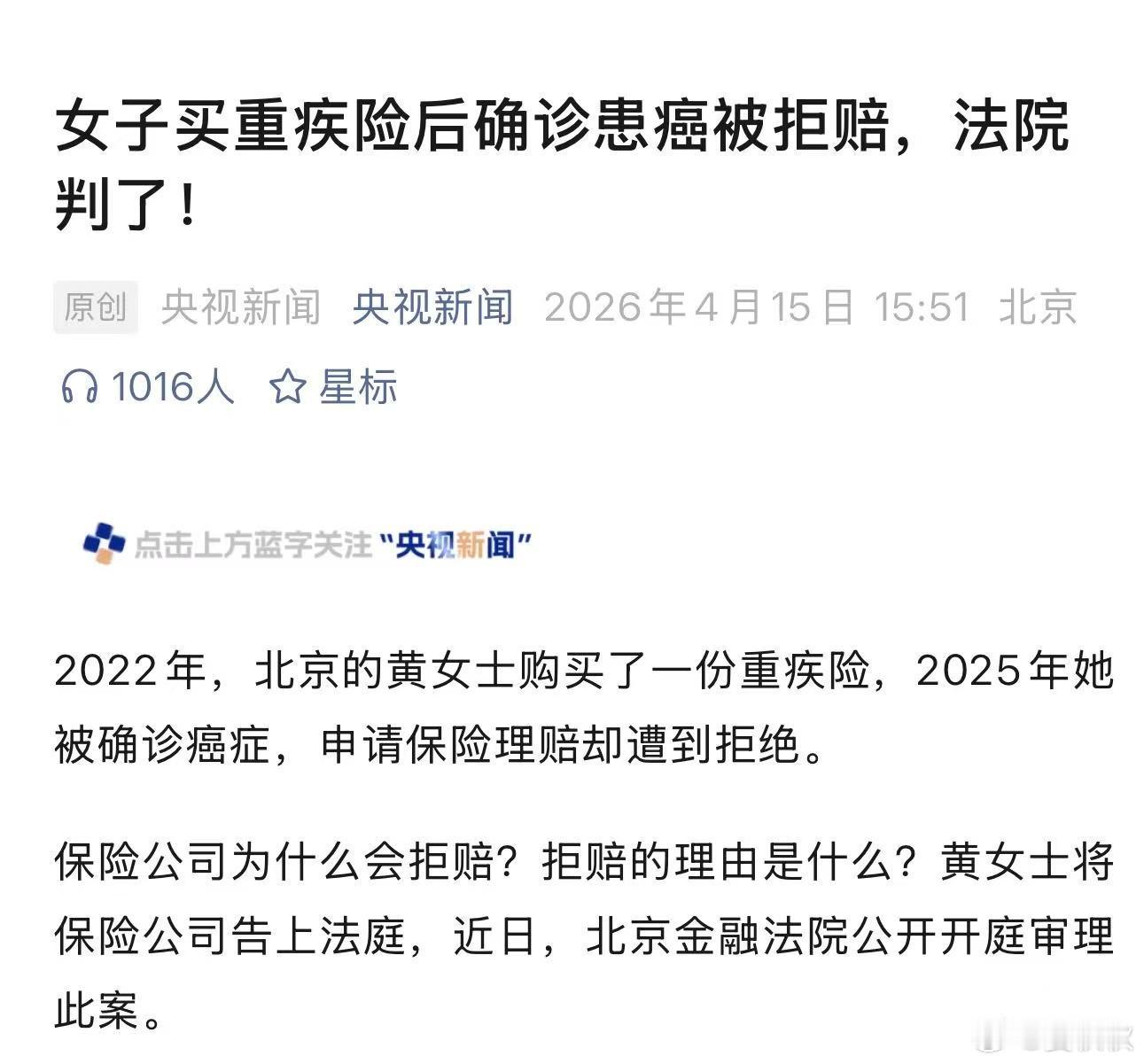保险、理赔、打官司……很多人一听到就头痛。条款那么厚,字又那么小,感觉怎么说都是保险公司有理。但最近,北京金融法院判的一个案子,可以说是给普通老百姓出了口气,说得在理,判得漂亮,个人感觉,应当成为判例。事情是这样的。2022年夏天,北京一位黄女士,想给患癌的母亲买份保险。咨询过程中,在销售的推荐下,黄女士为自己买了一份重疾险,还加了二次赔付的选项,前前后后保费交了十九万多。时间一晃,到了2025年初,黄女士自己不幸查出了肺癌。家里正需要钱治病的时候,她想起了这份保险,可申请递上去,等来的却是一纸“拒赔通知”,上面就冷冰冰地说“不构成赔偿条件”。黄女士懵了。直到后来闹上法庭,她才搞明白保险公司真正的理由:说她“未如实告知”,隐瞒了母亲和外婆的癌症家族史,影响了保险公司的判断。这话听着“专业”,但经不起琢磨。法院一查就发现了关键问题:投保时,电子表格里问的是“被保险人是否患有或曾患过下列疾病”,里面列了“遗传性疾病”。但保险公司说,你没告知“肿瘤家族史”,所以违规了。哎,这就有点“玩文字游戏”的意思了。法官说得特别在理:对普通老百姓来说,“肿瘤家族史”和“遗传性疾病”是一回事吗?谁会在填表的时候,自动把“我妈得过癌”归到“我有遗传病”这个选项里去?这明显超出了普通人的理解范围。法院认定,保险公司根本没就“肿瘤家族史”做出过明确、有效的询问。你自己不问清楚,回头却怪别人没说,这道理到哪儿都说不通。更让人生气的,是另一个细节。黄女士当庭就说,她买保险时明明告诉过那个销售员:“我妈得了癌,所以才想问问。”法院也认定了这个事实。你看,这不就等于保险公司其实已经知道了吗?自己知道了,公司却装作不知道,回头还用自己没问清的条款来卡人拒赔,这做法,是不是有点不厚道?所以,北京金融法院的判决干脆利索:驳回保险公司上诉,该赔50万一分不能少。这个判决,好就好在它完全站在了普通消费者的立场上,去考虑问题。法官没去抠那些复杂的条款字眼,而是看实质:一个普通人,在销售引导下买了保险,主动说了已知的家庭情况,两年后自己患病,这哪里能扯上“骗保”?我觉得,这个判例,真应该推广开来。它告诉所有的保险公司:你们是专业的,合同是你们定的,问什么问题,必须清清楚楚、明明白白。别用那些绕来绕去的专业术语,给老百姓设套。同时,它也给了普通人一颗定心丸。法律是讲道理、通人情的。当那些“巨无霸”公司想用格式合同的“武器”,来对付单个消费者时,法院会站出来,看看谁真的在理。以后的判决,都应该多看看老百姓手里的“情理”,少被那些冷冰冰的“条款文字”牵着鼻子走。这样的公道,越多越好。