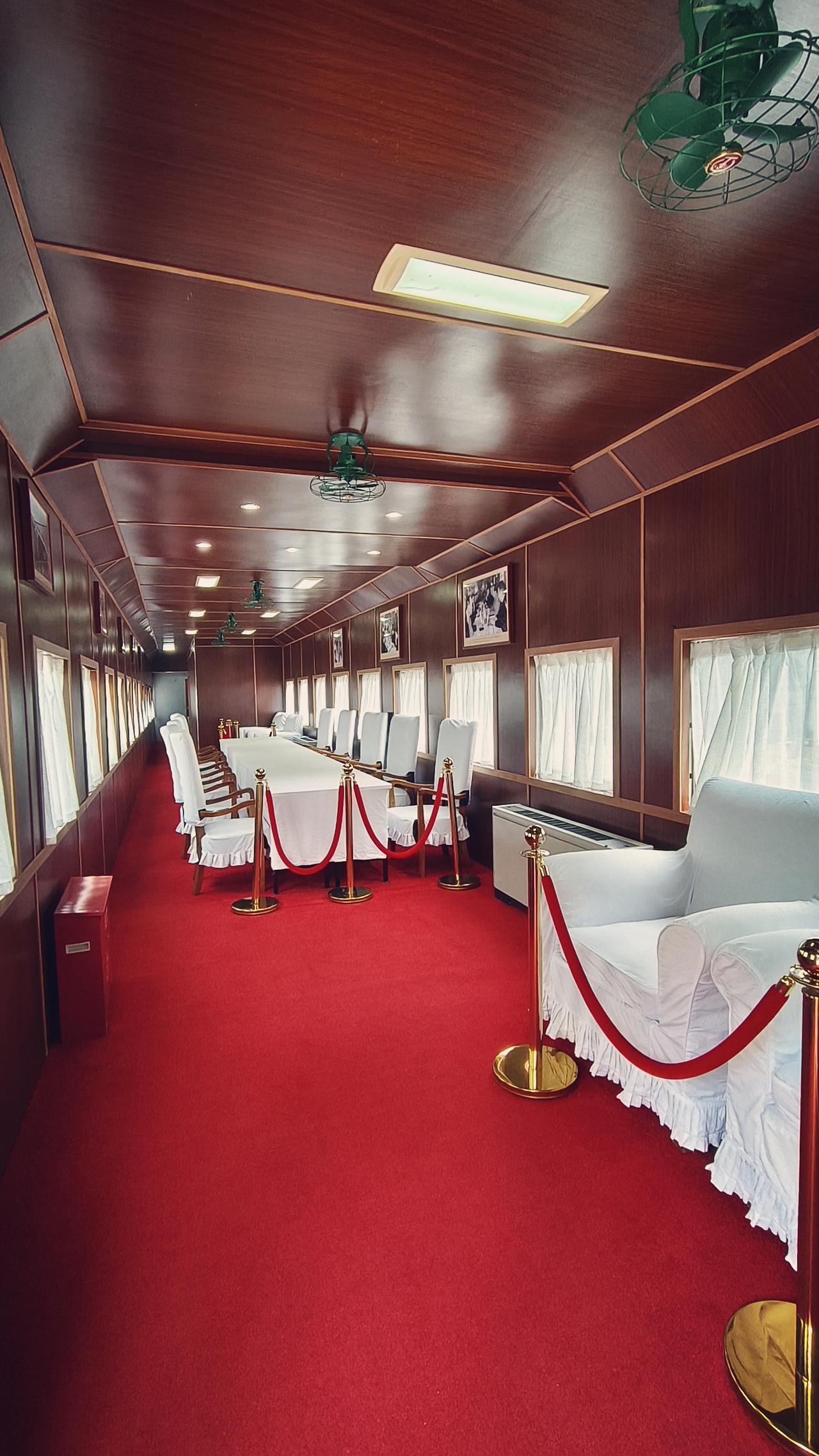 不同于南京众多的民国饭店,这座始建于1969年6月的饭店,其核心用途是为老一辈党和国家领导人来南京时,提供专列停靠与临时下榻的场所而建造的。这座独享约500亩茂林修竹的清幽园林,配套修建了从南京火车站直通伊刘村的火车专用支线,专列可直接驶入隐蔽的山洞站台。在60年后的今天,建设号列车静静停在伊村饭店园区内的专轨上,高大威猛印有东方红字样的火车头及略显斑驳的车身,在一片盛开二月兰的簇拥下,仿佛在向参观者讲述着领导人乘车巡视大江南北、为国操劳的故事……(如图:2~5所示)