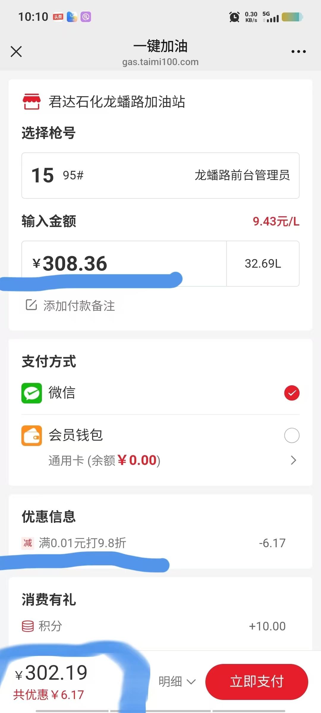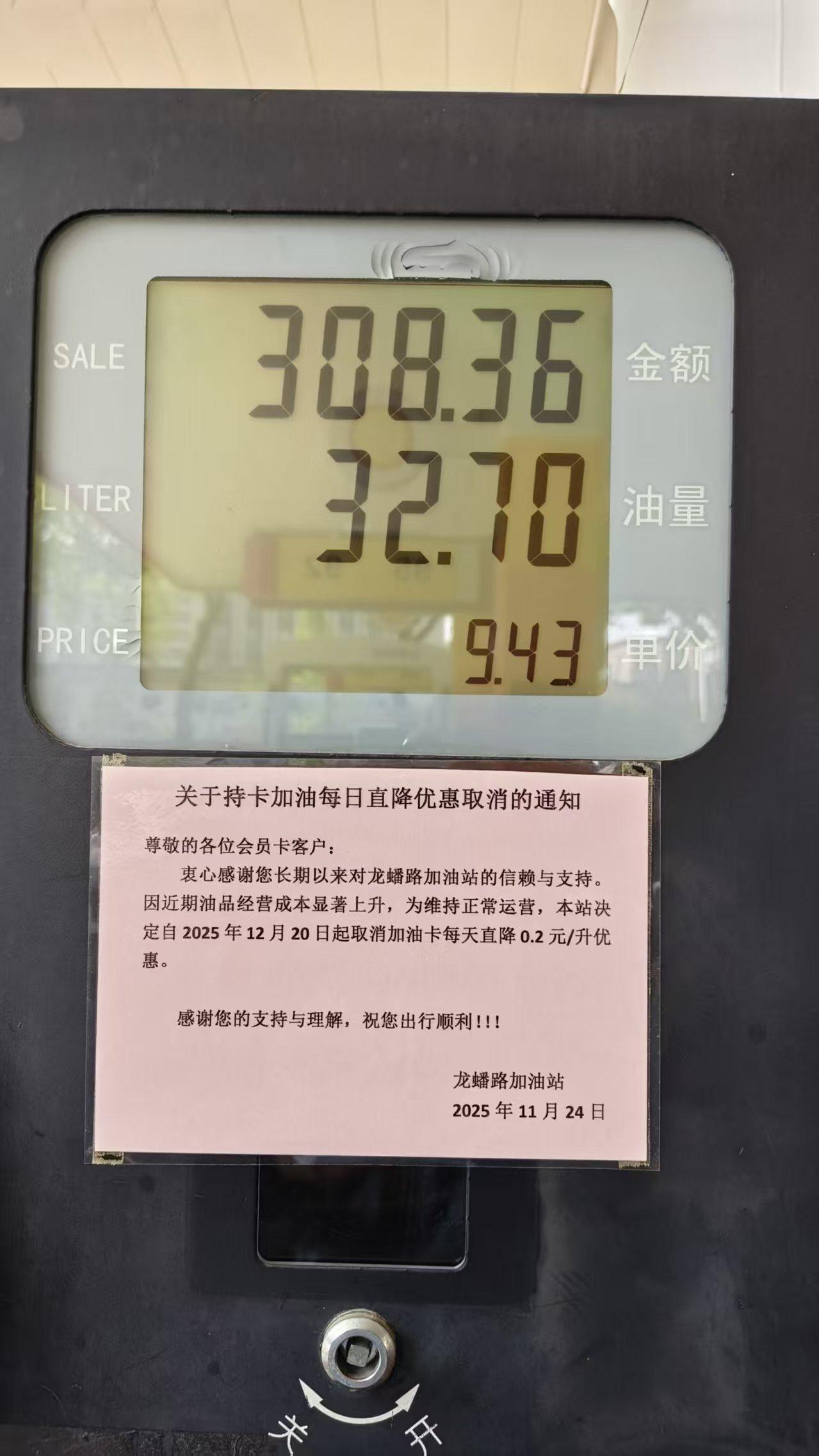 截至2026年4月15日(周三),南京地区国标VI汽油统一零售价为:92号汽油:8.87元/升;95号汽油:9.43元/升。笔者在南京龙蟠路上的一家加油站,加了32.69L95号汽油,总计:308.36。由于本人是该站扫码会员,给打了个9.8折,实付302.19元,省了6.17元。