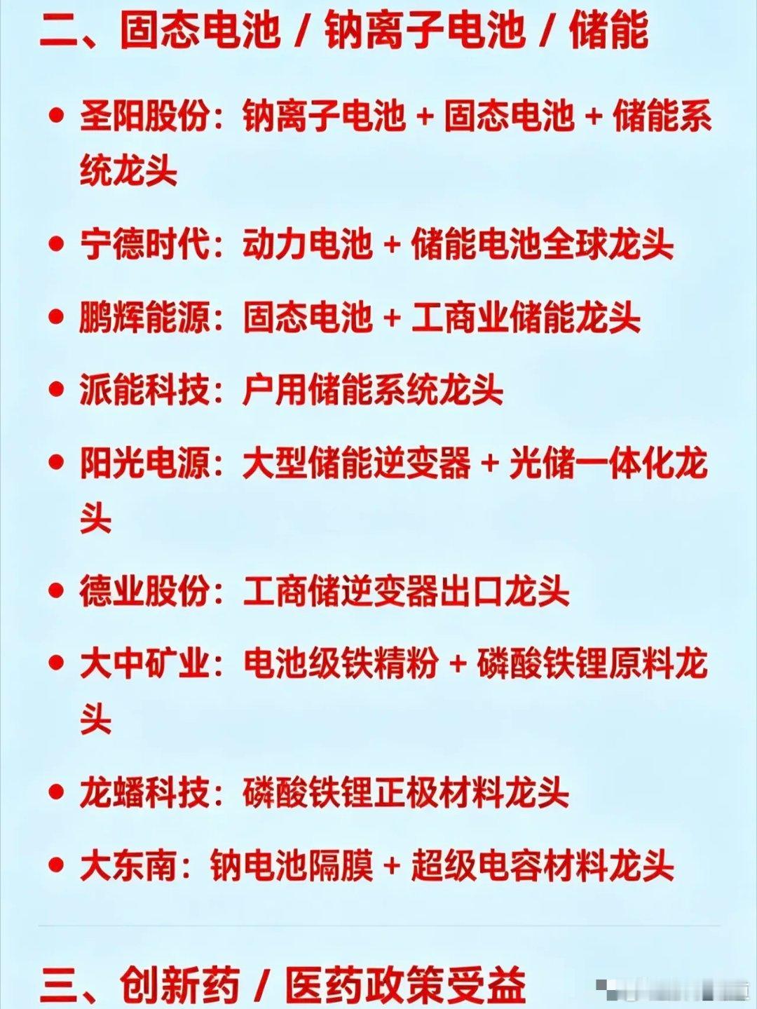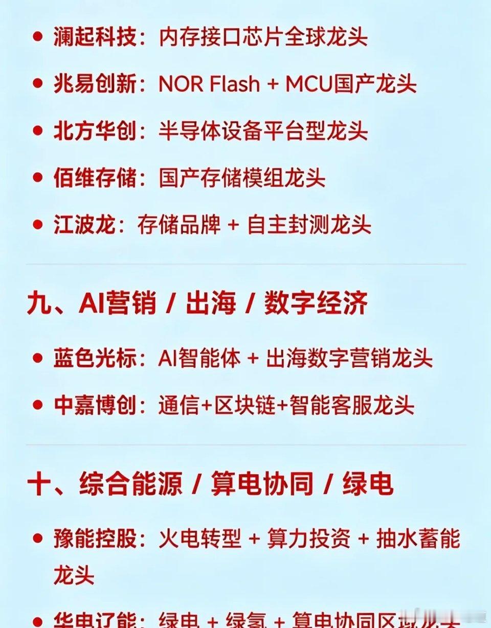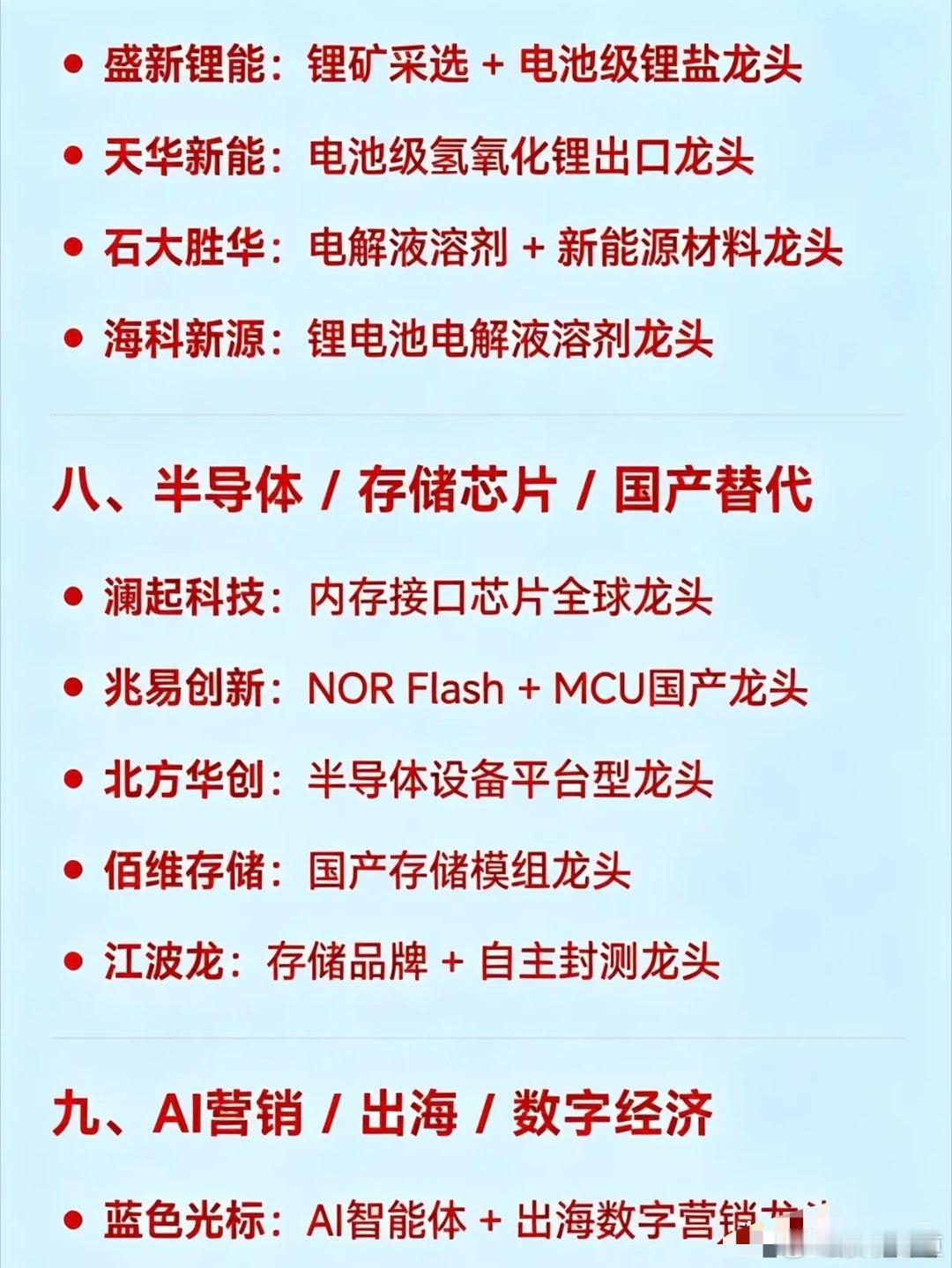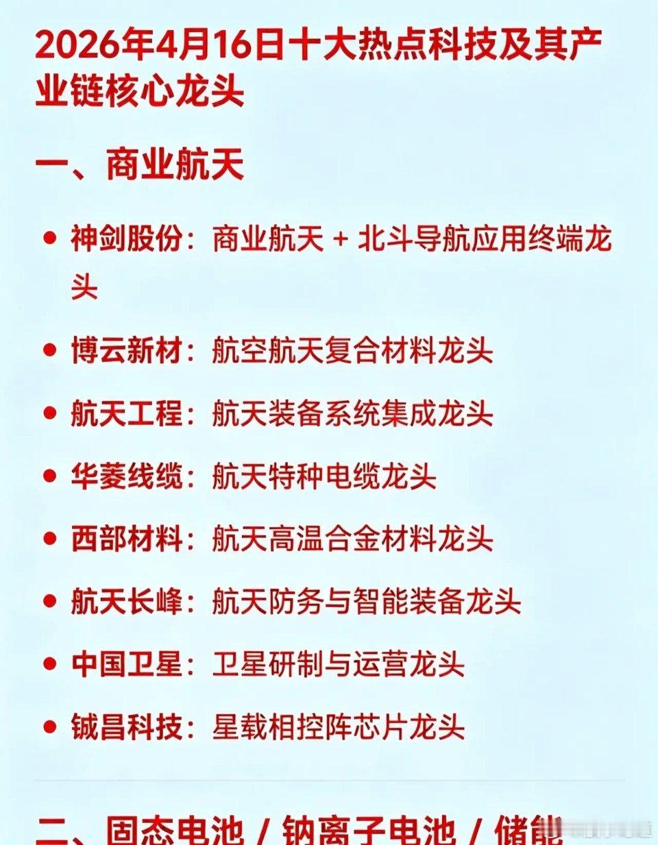 2026年4月16日十大热点科技及其产业链核心龙头一、商业航天神剑股份:商业航天 + 北斗导航应用终端龙头博云新材:航空航天复合材料龙头航天工程:航天装备系统集成龙头华菱线缆:航天特种电缆龙头西部材料:航天高温合金材料龙头航天长峰:航天防务与智能装备龙头中国卫星:卫星研制与运营龙头铖昌科技:星载相控阵芯片龙头二、固态电池 / 钠离子电池 / 储能圣阳股份:钠离子电池 + 固态电池 + 储能系统龙头宁德时代:动力电池 + 储能电池全球龙头鹏辉能源:固态电池 + 工商业储能龙头派能科技:户用储能系统龙头阳光电源:大型储能逆变器 + 光储一体化龙头德业股份:工商储逆变器出口龙头大中矿业:电池级铁精粉 + 磷酸铁锂原料龙头龙蟠科技:磷酸铁锂正极材料龙头大东南:钠电池隔膜 + 超级电容材料龙头三、创新药 / 医药政策受益哈药股份:维生素 + 创新药 + 医药电商龙头昂利康:原料药 + 创新药制剂一体化龙头博瑞医药:高端仿制药 + 创新药CDMO龙头瑞康医药:医药流通 + 医疗服务龙头金陵药业:中药 + 医院运营龙头海正药业:抗感染类创新药龙头鹭燕医药:区域医药商业龙头双鹭药业:基因工程药物龙头津药药业:皮质激素类原料药龙头健信超导:医疗影像设备(MRI)核心部件龙头益佰制药:抗肿瘤中成药龙头华人健康:连锁药店 + 医药零售龙头北大医药:化学制剂 + 医药流通龙头康恩贝:中药 + 植物提取物龙头荣昌生物:ADC创新药龙头信立泰:心血管创新药龙头海欣股份:抗肿瘤疫苗 + 生物药龙头四、算力租赁 / AI算力基础设施利通电子:算力租赁 + 东数西算核心标的龙头鸿博股份:AI智算中心 + 英伟达合作算力租赁龙头工业富联:AI服务器全球代工龙头真视通:政企算力解决方案龙头美利云:数据中心 + 算力基础设施运营龙头协创数据:边缘计算 + 算力设备制造龙头宏景科技:城市算力网络建设龙头五、特高压 / 柔性直流输电 / 电网设备中国西电:特高压开关 + 柔性直流输电装备龙头汉缆股份:高压电缆 + 特高压导线龙头华菱线缆:特种电力电缆龙头起帆电缆:电力传输线缆龙头六、PCB / 人形机器人 / 消费电子世运电路:汽车PCB + 人形机器人电路板龙头沪电股份:AI服务器高端PCB龙头福蓉科技:折叠屏手机铝合金结构件龙头春秋电子:消费电子精密结构件龙头乐凯胶片:光学膜 + 柔性显示材料龙头七、锂电材料 / 锂资源盐湖股份:盐湖提锂 + 钾肥双龙头华友钴业:三元前驱体 + 镍钴锂一体化龙头盛新锂能:锂矿采选 + 电池级锂盐龙头天华新能:电池级氢氧化锂出口龙头石大胜华:电解液溶剂 + 新能源材料龙头海科新源:锂电池电解液溶剂龙头八、半导体 / 存储芯片 / 国产替代澜起科技:内存接口芯片全球龙头兆易创新:NOR Flash + MCU国产龙头北方华创:半导体设备平台型龙头佰维存储:国产存储模组龙头江波龙:存储品牌 + 自主封测龙头九、AI营销 / 出海 / 数字经济蓝色光标:AI智能体 + 出海数字营销龙头中嘉博创:通信+区块链+智能客服龙头十、综合能源 / 算电协同 / 绿电豫能控股:火电转型 + 算力投资 + 抽水蓄能龙头华电辽能:绿电 + 绿氢 + 算电协同区域龙头免责声明:发文涉及资讯图等内容来自网络公共信息。仅供科普,不构成任何投资依据。今日看盘股票