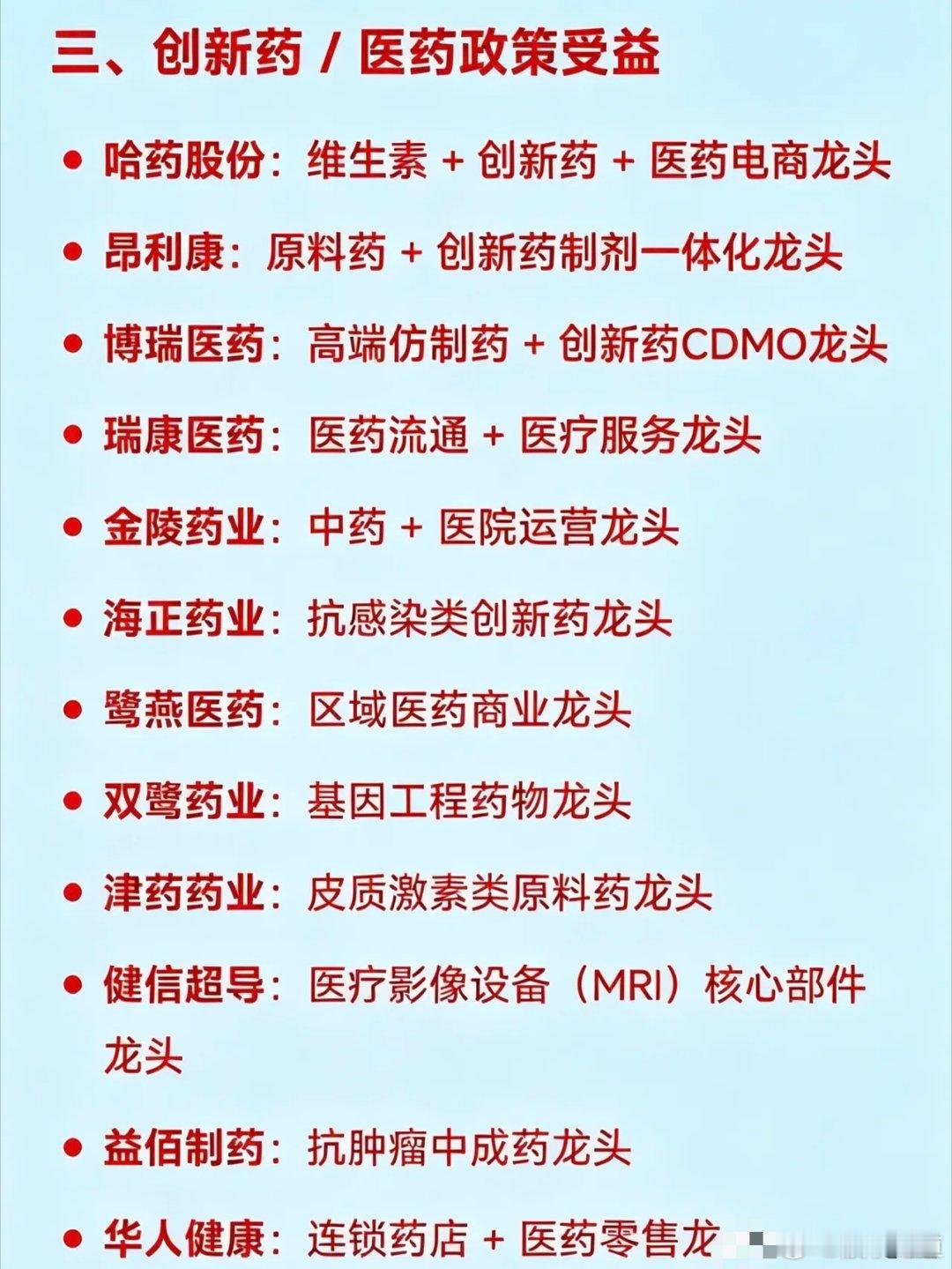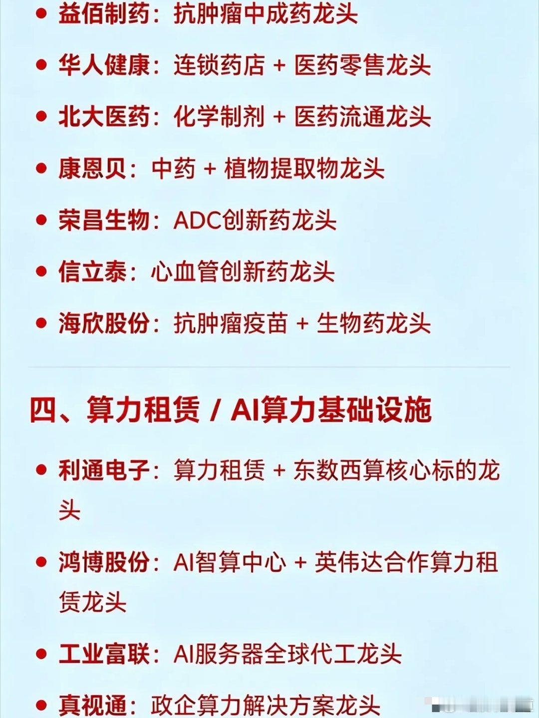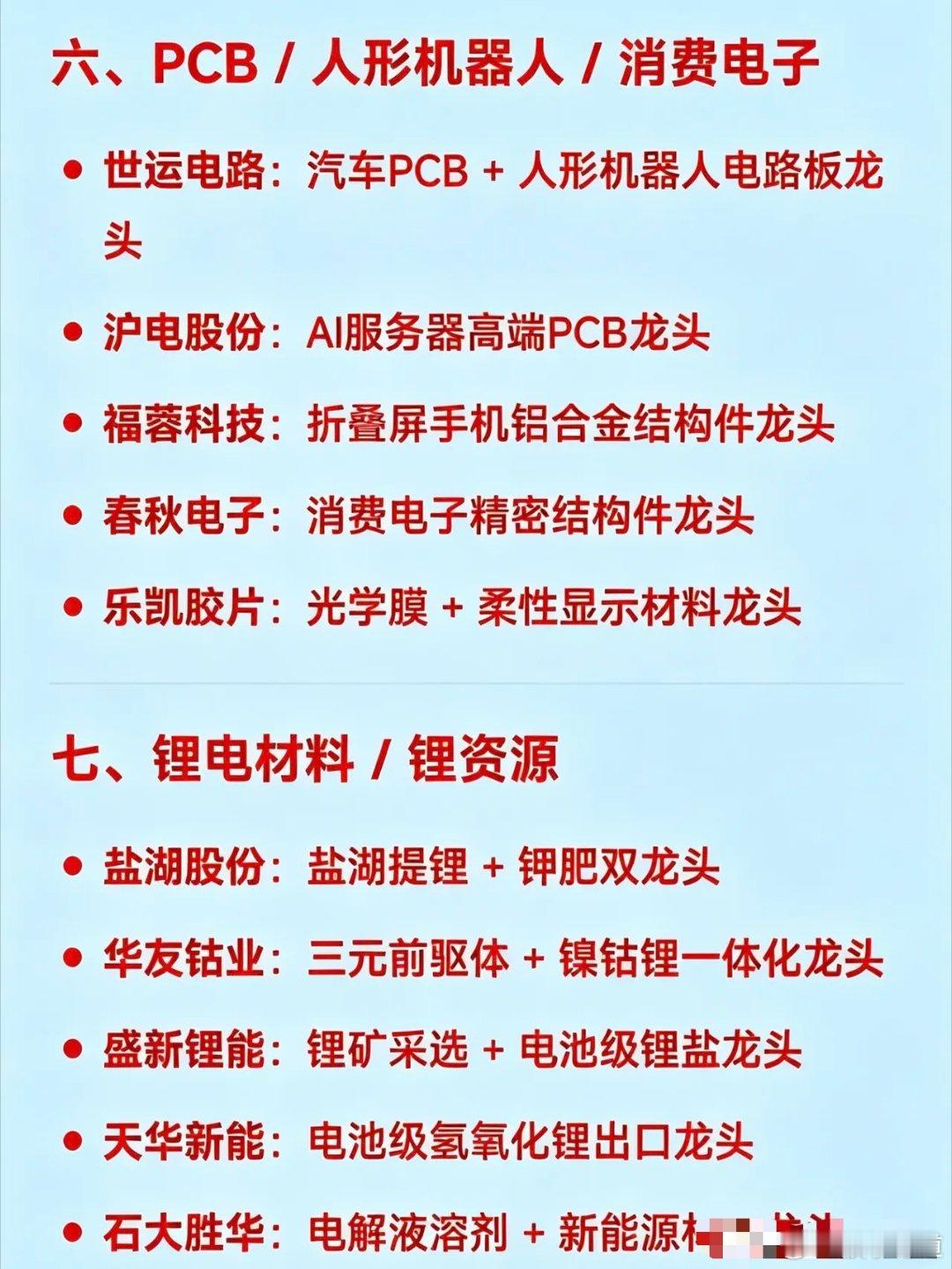 2026年4月16日十大热点科技及其产业链核心龙头一、商业航天神剑股份:商业航天 + 北斗导航应用终端龙头博云新材:航空航天复合材料龙头航天工程:航天装备系统集成龙头华菱线缆:航天特种电缆龙头西部材料:航天高温合金材料龙头航天长峰:航天防务与智能装备龙头中国卫星:卫星研制与运营龙头铖昌科技:星载相控阵芯片龙头二、固态电池 / 钠离子电池 / 储能圣阳股份:钠离子电池 + 固态电池 + 储能系统龙头宁德时代:动力电池 + 储能电池全球龙头鹏辉能源:固态电池 + 工商业储能龙头派能科技:户用储能系统龙头阳光电源:大型储能逆变器 + 光储一体化龙头德业股份:工商储逆变器出口龙头大中矿业:电池级铁精粉 + 磷酸铁锂原料龙头龙蟠科技:磷酸铁锂正极材料龙头大东南:钠电池隔膜 + 超级电容材料龙头三、创新药 / 医药政策受益哈药股份:维生素 + 创新药 + 医药电商龙头昂利康:原料药 + 创新药制剂一体化龙头博瑞医药:高端仿制药 + 创新药CDMO龙头瑞康医药:医药流通 + 医疗服务龙头金陵药业:中药 + 医院运营龙头海正药业:抗感染类创新药龙头鹭燕医药:区域医药商业龙头双鹭药业:基因工程药物龙头津药药业:皮质激素类原料药龙头健信超导:医疗影像设备(MRI)核心部件龙头益佰制药:抗肿瘤中成药龙头华人健康:连锁药店 + 医药零售龙头北大医药:化学制剂 + 医药流通龙头康恩贝:中药 + 植物提取物龙头荣昌生物:ADC创新药龙头信立泰:心血管创新药龙头海欣股份:抗肿瘤疫苗 + 生物药龙头四、算力租赁 / AI算力基础设施利通电子:算力租赁 + 东数西算核心标的龙头鸿博股份:AI智算中心 + 英伟达合作算力租赁龙头工业富联:AI服务器全球代工龙头真视通:政企算力解决方案龙头美利云:数据中心 + 算力基础设施运营龙头协创数据:边缘计算 + 算力设备制造龙头宏景科技:城市算力网络建设龙头五、特高压 / 柔性直流输电 / 电网设备中国西电:特高压开关 + 柔性直流输电装备龙头汉缆股份:高压电缆 + 特高压导线龙头华菱线缆:特种电力电缆龙头起帆电缆:电力传输线缆龙头六、PCB / 人形机器人 / 消费电子世运电路:汽车PCB + 人形机器人电路板龙头沪电股份:AI服务器高端PCB龙头福蓉科技:折叠屏手机铝合金结构件龙头春秋电子:消费电子精密结构件龙头乐凯胶片:光学膜 + 柔性显示材料龙头七、锂电材料 / 锂资源盐湖股份:盐湖提锂 + 钾肥双龙头华友钴业:三元前驱体 + 镍钴锂一体化龙头盛新锂能:锂矿采选 + 电池级锂盐龙头天华新能:电池级氢氧化锂出口龙头石大胜华:电解液溶剂 + 新能源材料龙头海科新源:锂电池电解液溶剂龙头八、半导体 / 存储芯片 / 国产替代澜起科技:内存接口芯片全球龙头兆易创新:NOR Flash + MCU国产龙头北方华创:半导体设备平台型龙头佰维存储:国产存储模组龙头江波龙:存储品牌 + 自主封测龙头九、AI营销 / 出海 / 数字经济蓝色光标:AI智能体 + 出海数字营销龙头中嘉博创:通信+区块链+智能客服龙头十、综合能源 / 算电协同 / 绿电豫能控股:火电转型 + 算力投资 + 抽水蓄能龙头华电辽能:绿电 + 绿氢 + 算电协同区域龙头免责声明:发文涉及资讯图等内容来自网络公共信息。仅供科普,不构成任何投资依据。今日看盘股票