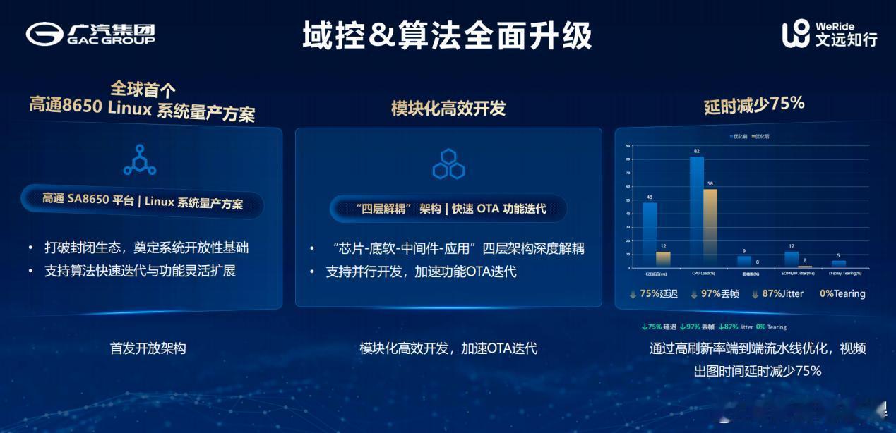 技术层面,系统做到了“不妥协”。192线激光雷达、4D毫米波雷达、11颗高清摄像头构建360度感知天网;全球首发高通8650 Linux量产方案,配合文远知行GENESIS世界模型和一段式端到端大模型,以200TOPS算力实现2000TOPS级的体验——这套技术组合曾助力文远知行斩获中国智驾大赛三连冠。安全方面,系统获得莱茵全球首个预期功能安全认证及功能安全ASIL D认证,覆盖99.9%行车场景。