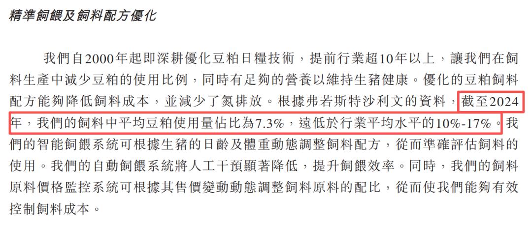 第一招,低豆日粮技术。中国养猪最大成本在饲料,而大豆对外依存度超80%,价格直接由芝加哥期货决定。牧原通过合成氨基酸替代豆粕,把豆粕占比压到7.3%,仅为行业平均水平一半。一头猪省31公斤大豆,全年累计减少大豆用量203万吨。这不是省钱,这是"藏粮于技",是从芝加哥期货交易所手里抢回定价权。