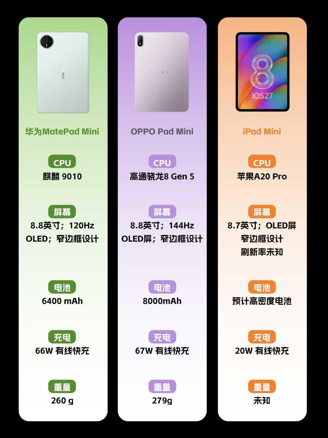 主要是现在小平板这块真的太卷了,像华为MatePad Mini,直8.8英寸+120Hz高刷OLED屏素质相当出色,搭配鸿蒙生态使用体验不用多说