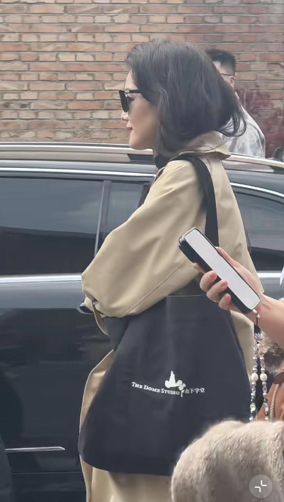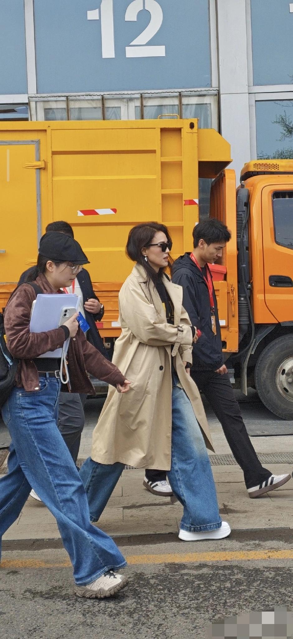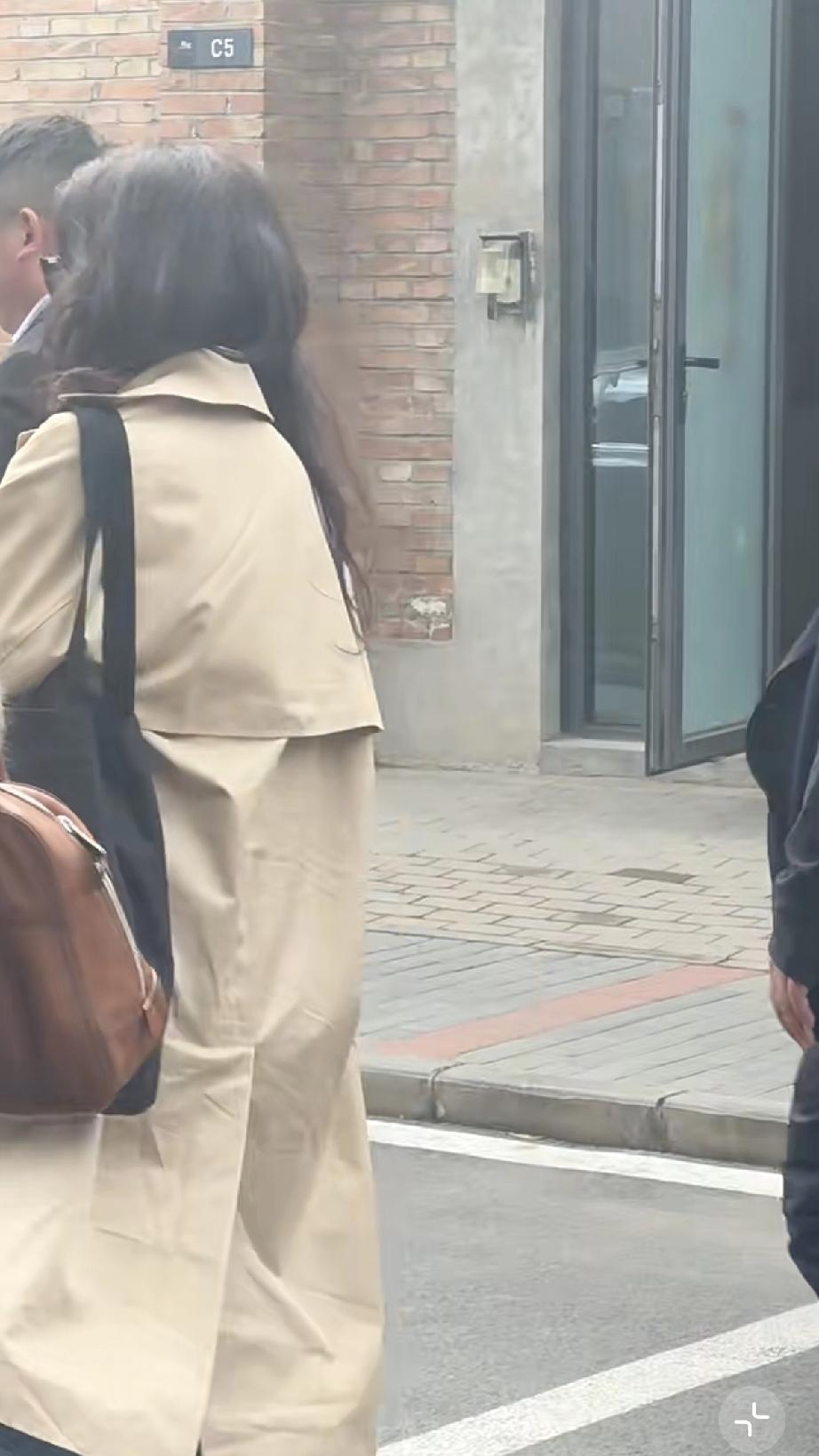 她穿了米咖色的风衣,白色的厚底运动鞋,还有牛仔裤,戴着墨镜提了一个包包,个子挺高的,一边走一边缩胳膊,可能是天气太冷了。