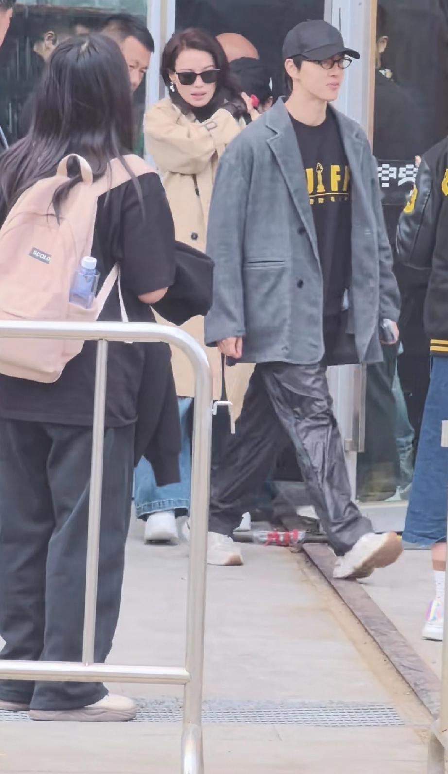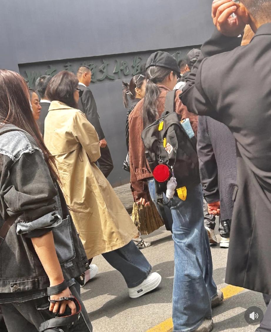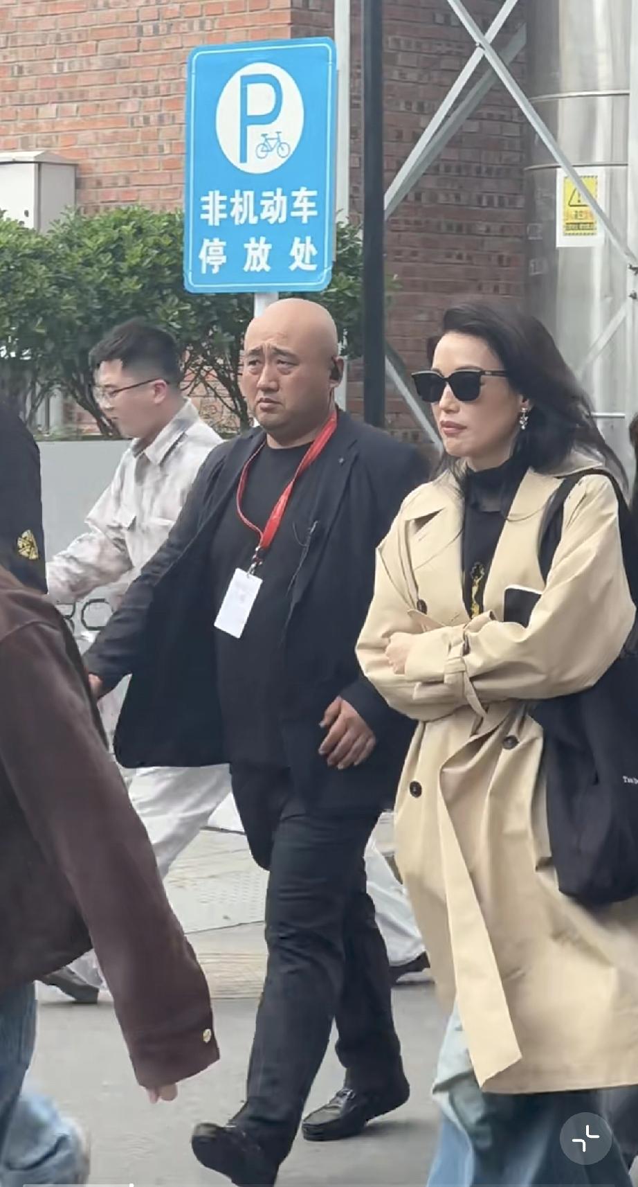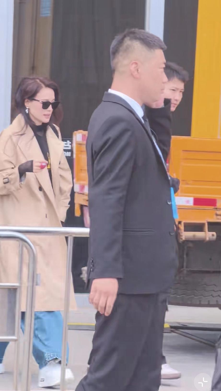 她穿了米咖色的风衣,白色的厚底运动鞋,还有牛仔裤,戴着墨镜提了一个包包,个子挺高的,一边走一边缩胳膊,可能是天气太冷了。