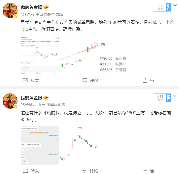 下午就开始说到晚上,信的人始终能吃得上这波肉,只要肯去执行就是吃到吐。提前布局4804 多单,减仓一半后迎来系统自动止盈,行情一路冲高至4842,直接再拿 260 点利润,一手就是 2600 美金!这样提前布局的策略你看哪位老师还能给到你。交易从来都是靠提前预判的策略和果断执行的魄力。在这里我把路给你铺好,你只需要迈开腿走就行。黄金金价
