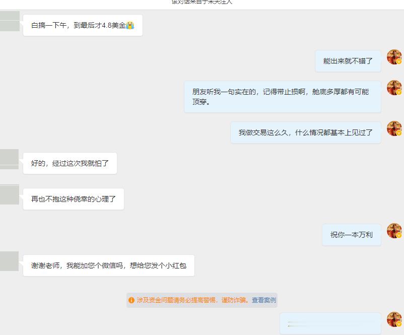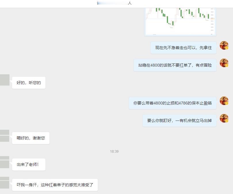我现在每天打开私信列表一看有粉丝走来问“老师怎么办”,都已经能自行脑补是怎么一回事了。无非就是没设置止损,仓都快要被顶穿了,要么就是已经爆仓了,这样的事情几乎每天都在重演。其实我不是神仙,我也无法改变市场行情的走向呀。像这位粉丝进场刚好行情反走,4800往上再顶那是不是就要爆仓了呢,我也并没有细问他的舱底够顶到哪里,只能给出相对比较理智的建议,所幸最后行情走低,成功走出来了,望引以为戒吧。黄金金价