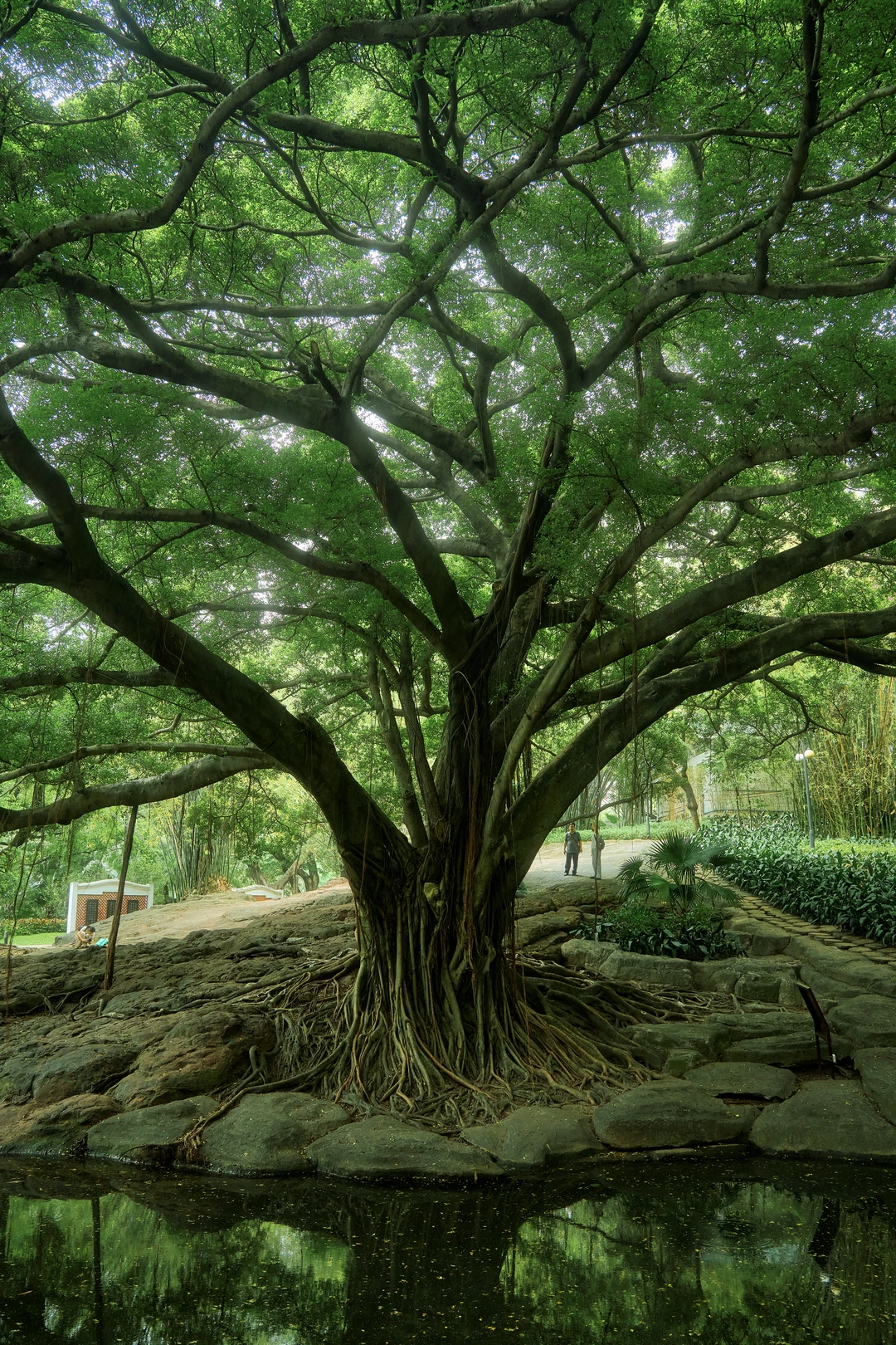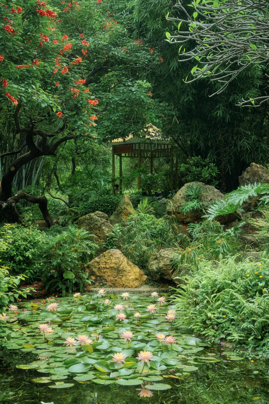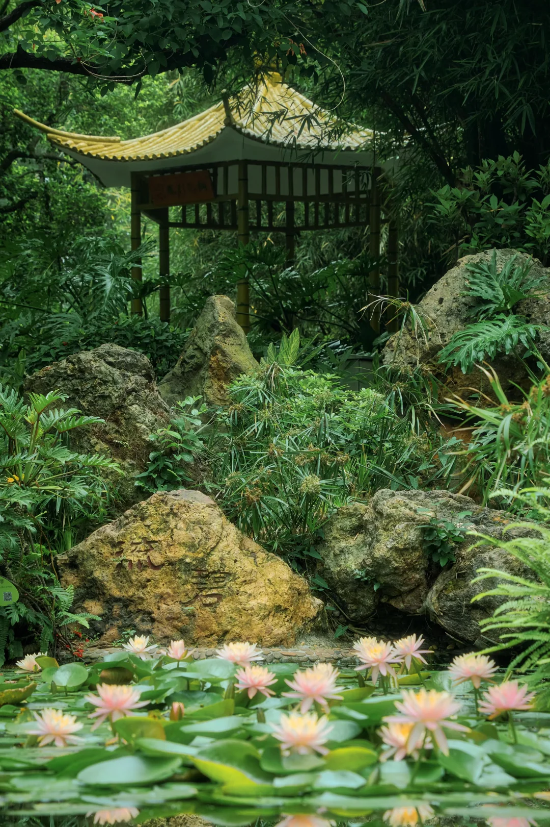 凉亭前的睡莲在池中盛放🪷古榕撑起整片天空,