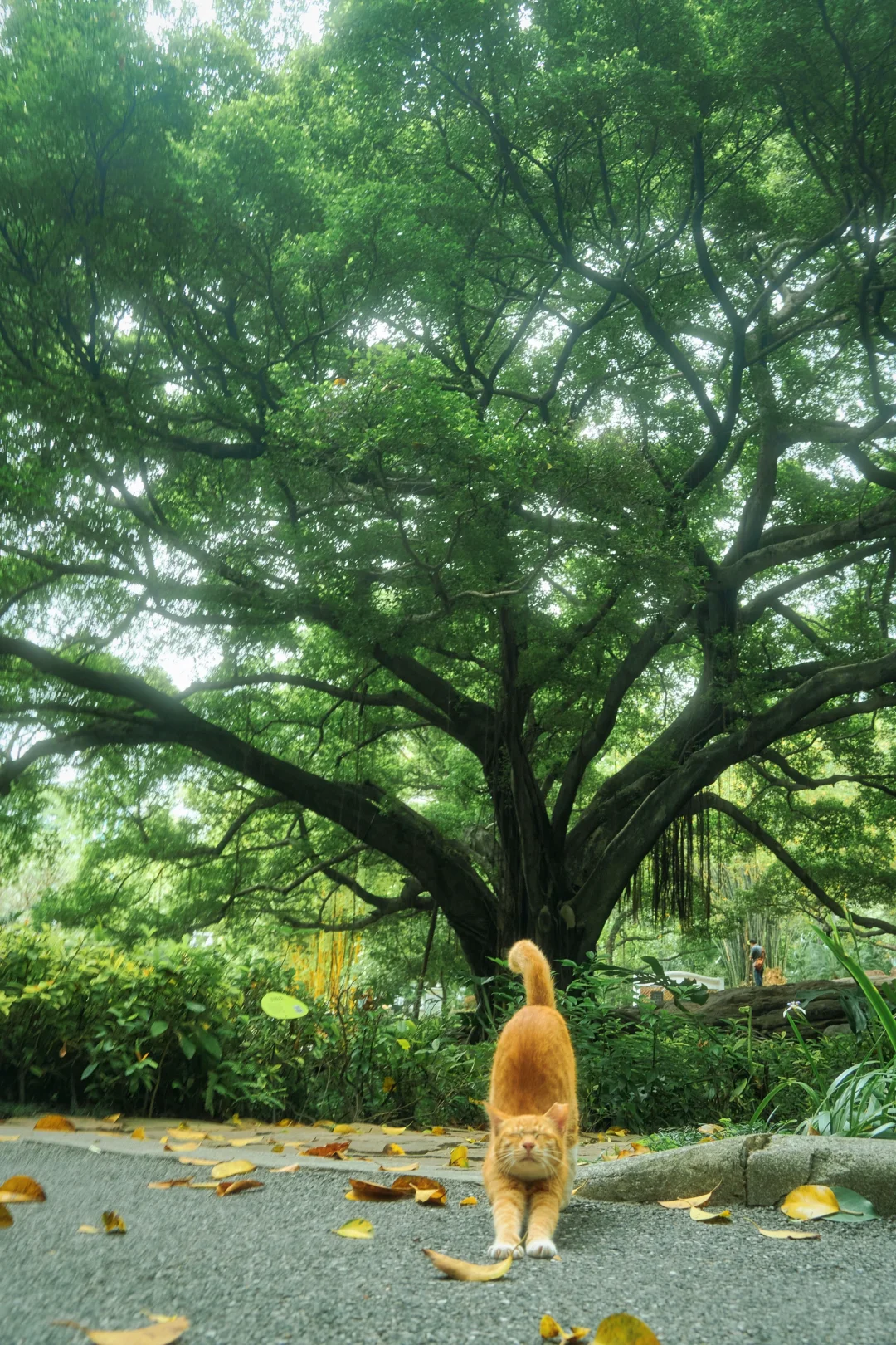 正对着大树疯狂按快门的时候,小家伙慢悠悠地从树后走出来,对着我毫无防备地伸了个大大的懒腰,身后铺展开的榕树枝桠,刚好像极了「大橘开屏」🦚🦚