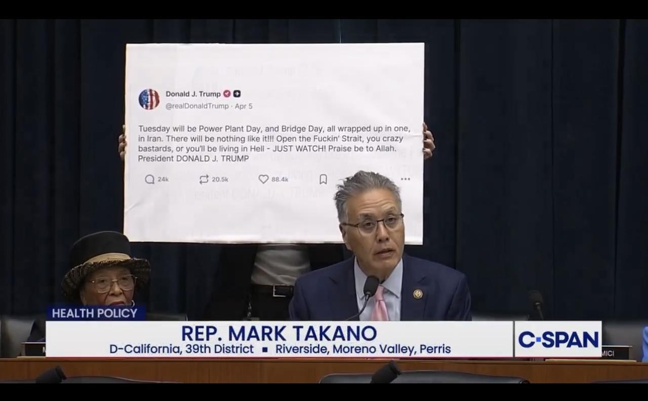 美国众议员RepMarkTakano:“您会坚持要求特朗普总统接受心理健康和情绪稳定评估吗?” 卫生部长小肯尼迪SecKennedy:“绝对不会。” 众议员Takano:“您正在选择对特朗普总统的忠诚,而不是对美国人民的忠诚。”