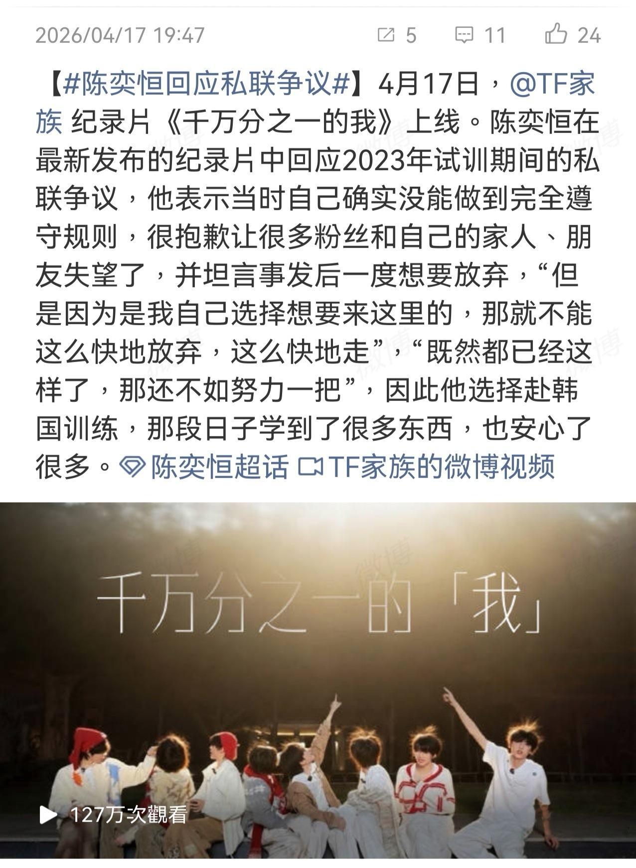 2026-04-17总结①短剧女演员曹赛亚回应私生指控与网暴,否认 “冷脸粉丝、无故拉黑”,直指涉事粉丝越界追星、恶意造谣。图1②宠物食品品牌“诚实一口”直播间主播公开贬低代言人郝熠然,郝熠然经纪公司终止合作,商家道歉 图2③王嘉尔演唱会跟粉丝互动方式太开放,有网友点"30岁该收敛"王嘉尔"Who you to tell me about me?"拒绝被年龄标签束缚 图3④邓紫棋小说《启示路》获得2025年度刀锋图书奖年度科幻 图4