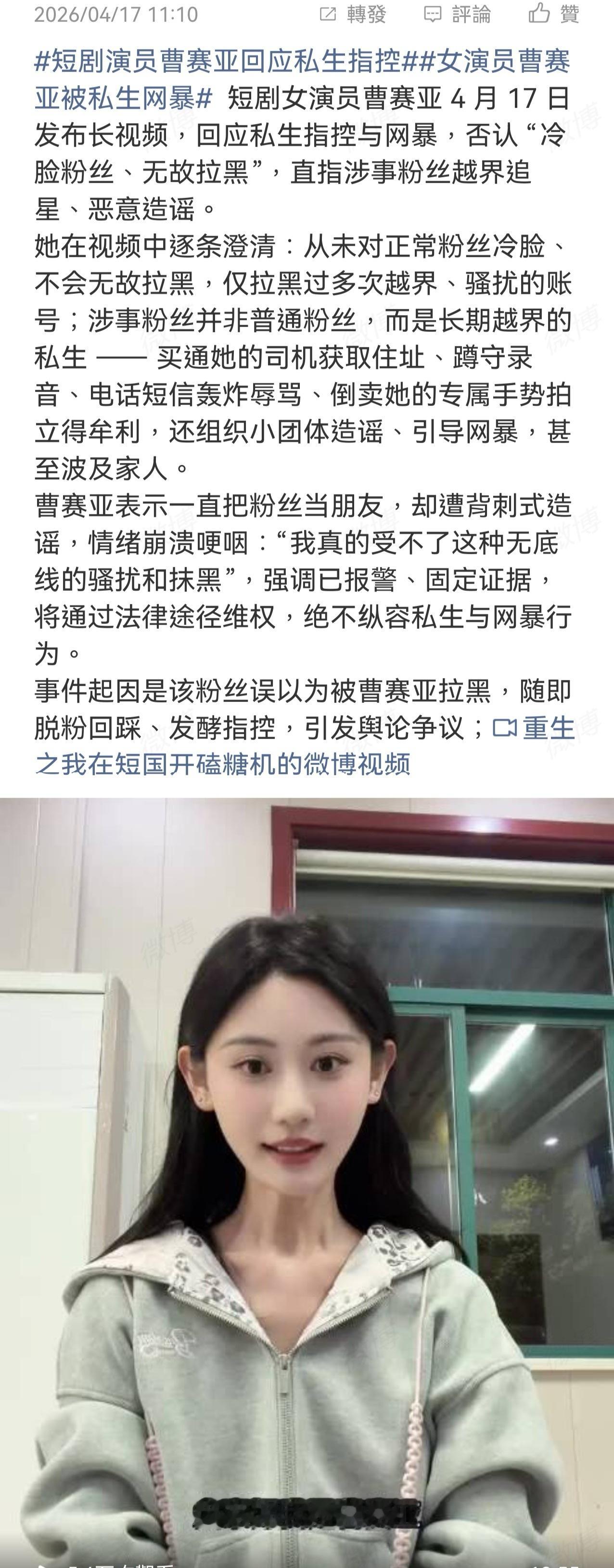 2026-04-17总结①短剧女演员曹赛亚回应私生指控与网暴,否认 “冷脸粉丝、