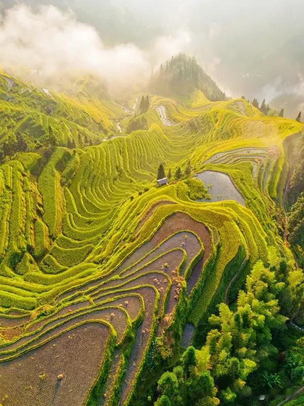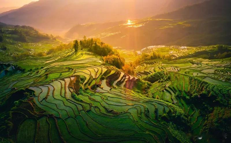 老家的田地风景,那简直是大自然绘就的绝美画卷。就像山西阳城县护驾村,春耕时从高空看,线条优美的田垄层层叠叠,新翻的褐色土壤、嫩绿的返青麦苗,还有金黄色的秸秆地块交织在一起,色彩绚丽极了。