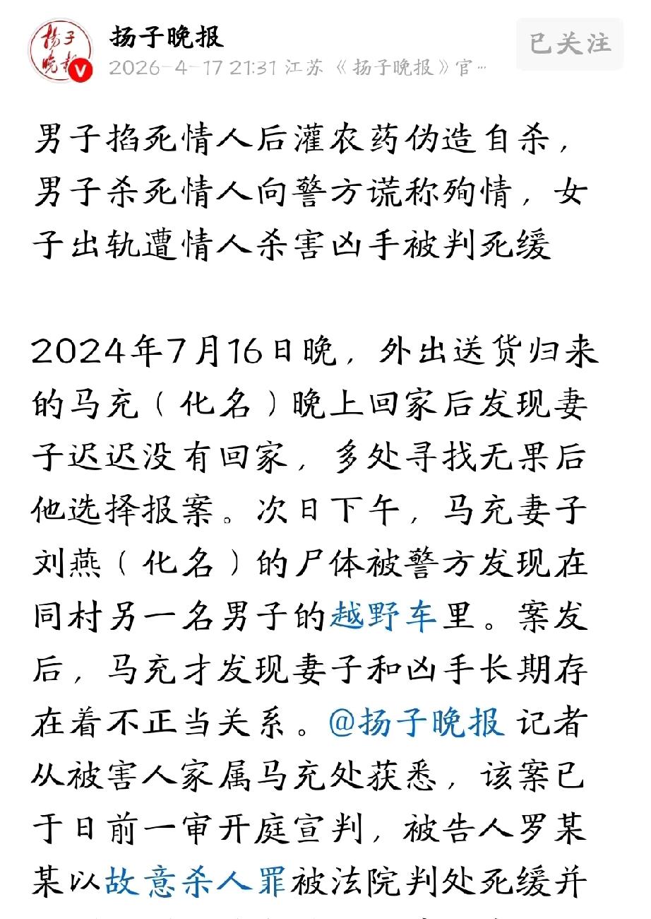 直到这时,丈夫马某才知道,妻子迟迟不归是遭遇了毒手,更让他难以接受的是,凶手竟是同村人,两人还有着长达几年的婚 外 情。