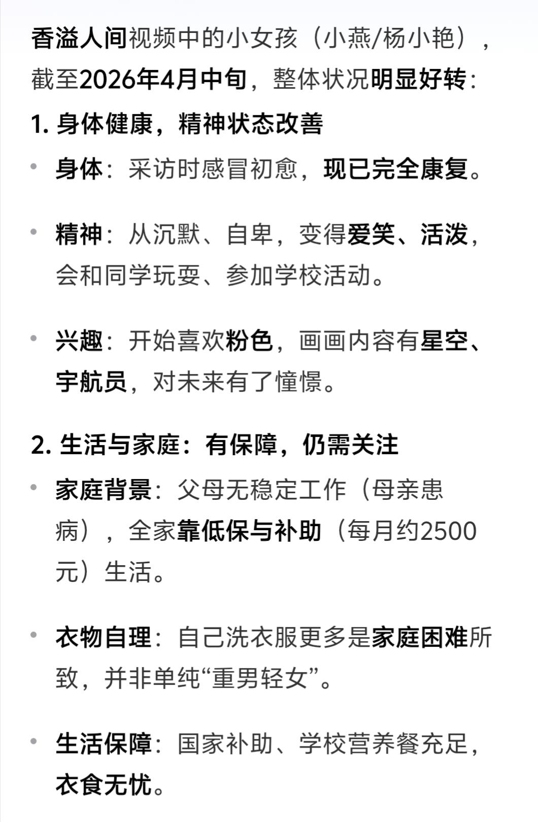 好在纪录片播出后,很快引起了多方关注,目前小女孩杨小燕的生活状况和精神状态都有了明显改善(详情在下面截图)。