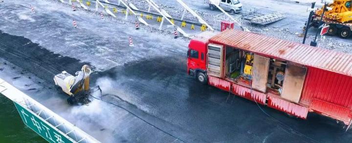 项目桥面处理工序取得阶段性进展。针对原桥沥青层厚度不均、无法采用常规铣刨设备施工的技术难点,项目部优化施工方案,采用8台挖机换装专用铲头集中作业,全桥2.4万平方米不等厚沥青已全部清理完成。同步开展的水力凿毛作业,目前已完成近五成工程量。