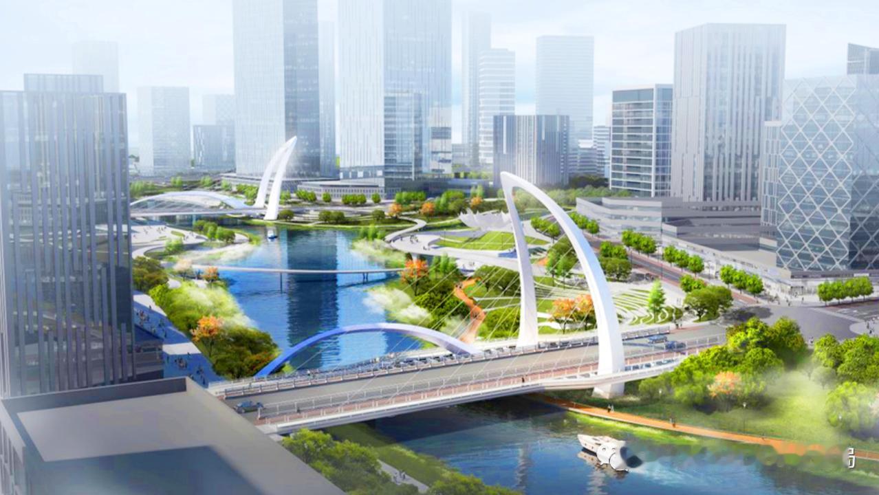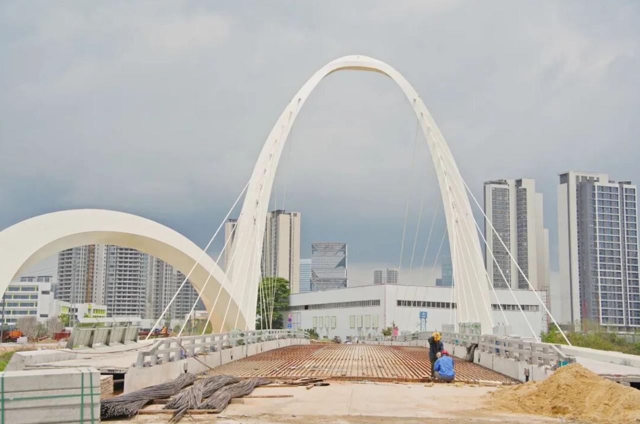 中轴涌4号桥作为B208路跨中轴涌的重要交通枢纽,全长107.5米、宽16米,是横沥岛尖“一桥一景”规划的关键节点,采用主梁与拱塔组合的结构形式,以椭圆形拱塔搭配单拱,通过异形变化空间曲面结构,生动诠释“双鳍逐浪”的设计理念。