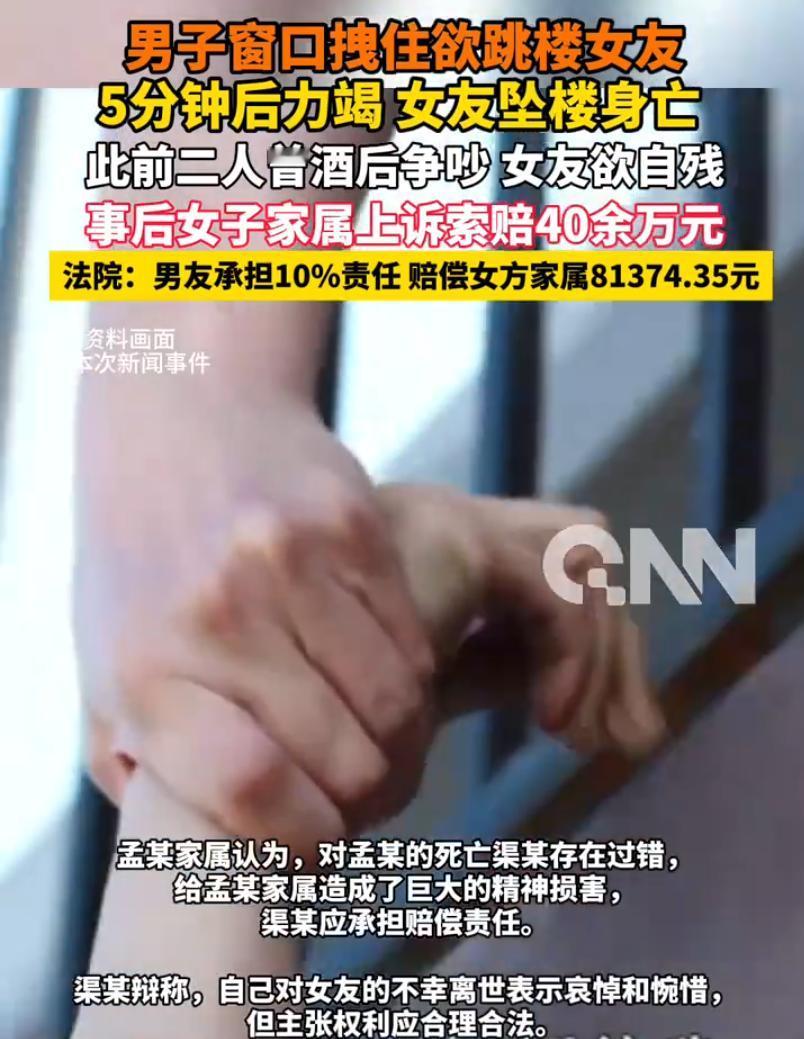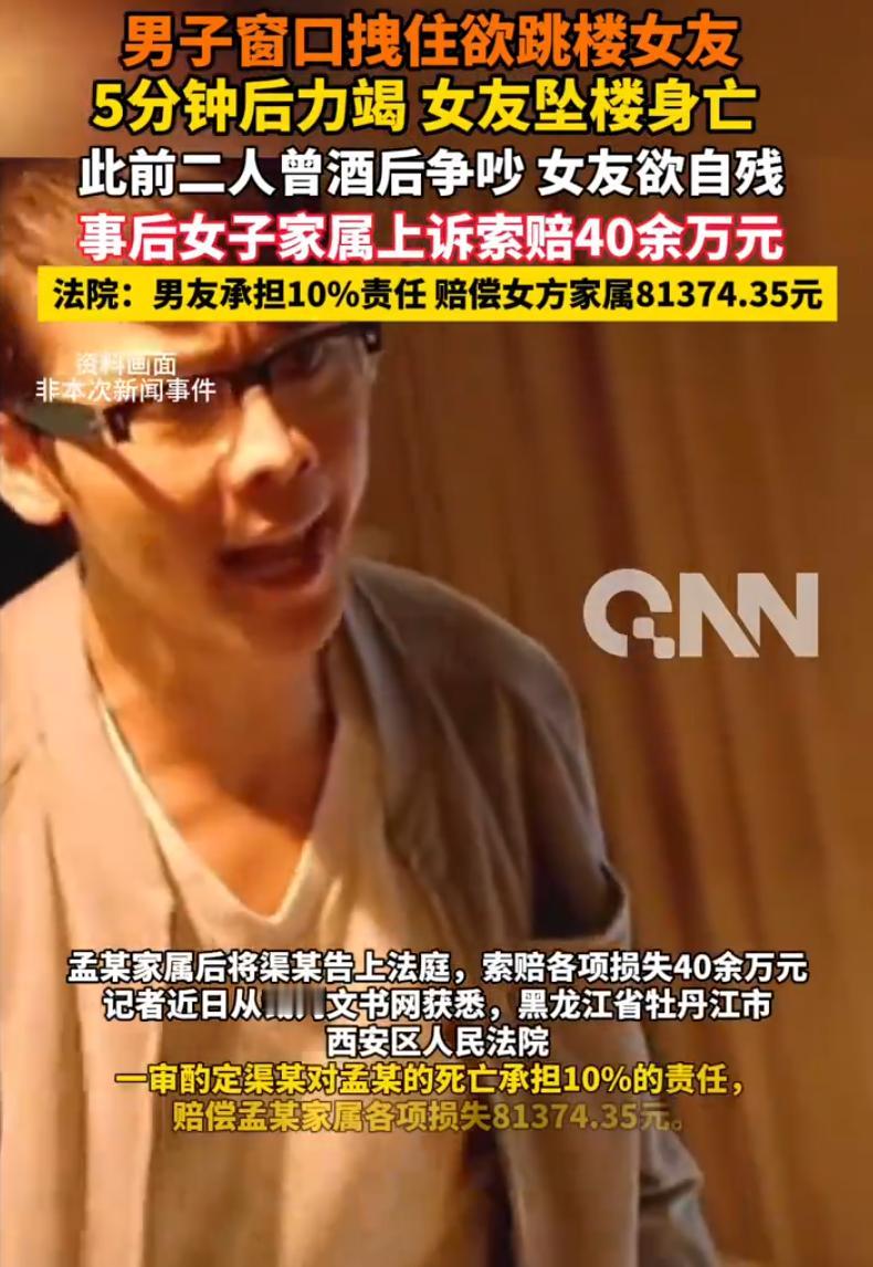 黑龙江牡丹江,一对情侣从酒吧喝完酒回家,期间两人发生争吵,女方一言不合就要跳楼,男子抓住女友的手,可坚持了五分钟最后还是没能拉上来发生了悲剧,事后女方家属将男子告上法庭,法院判决男子要承担责任