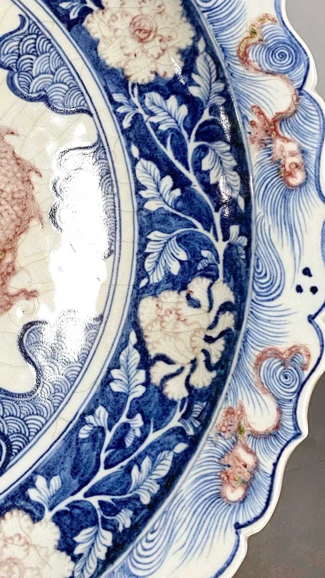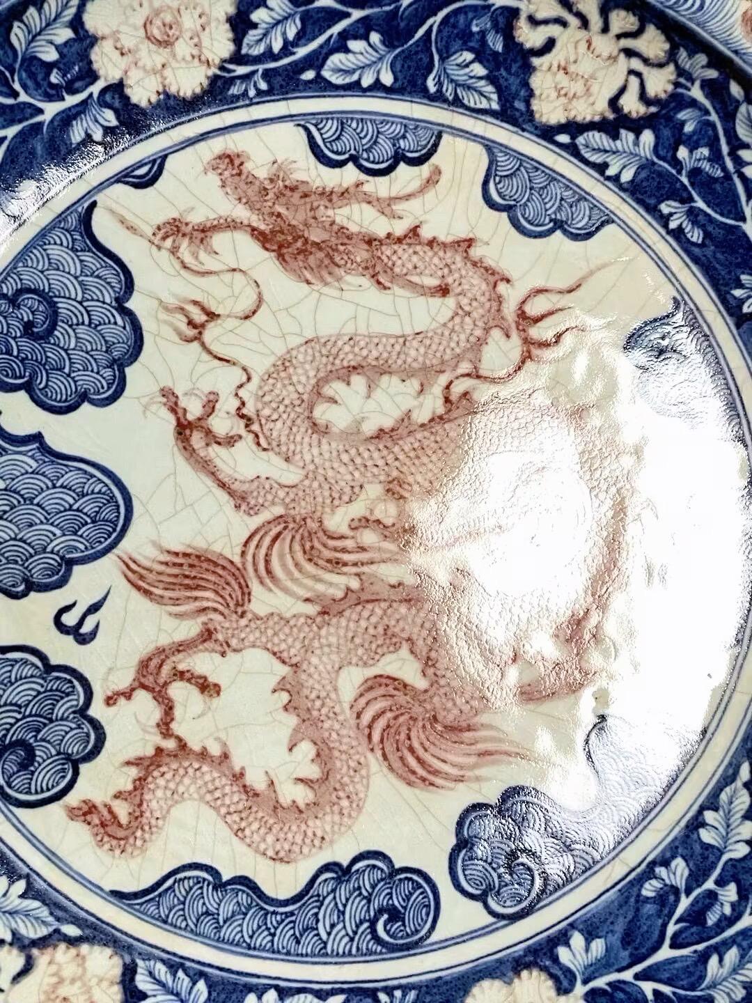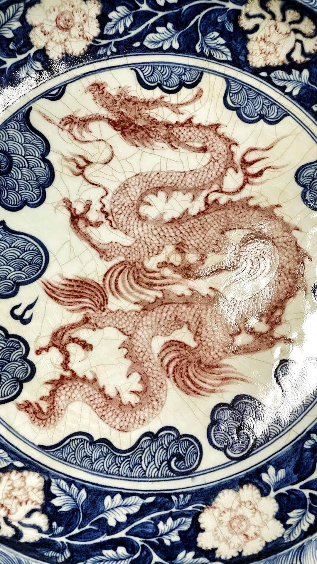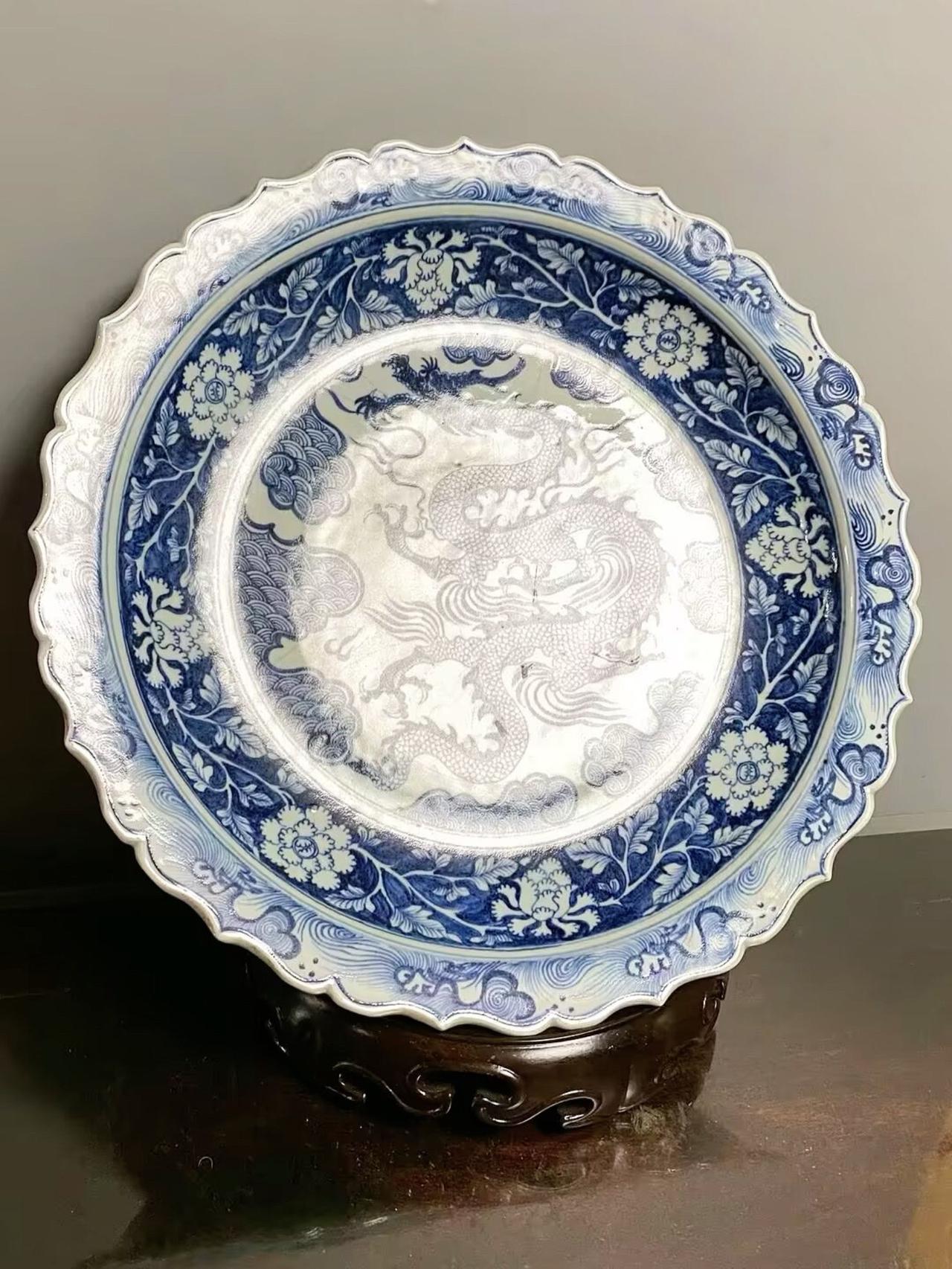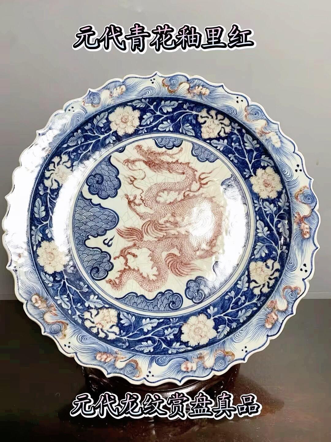 元青花龙纹菱口大赏盘,元代青花釉里红龙纹菱口赏盘;收藏十几年的两件宝物,真正大开