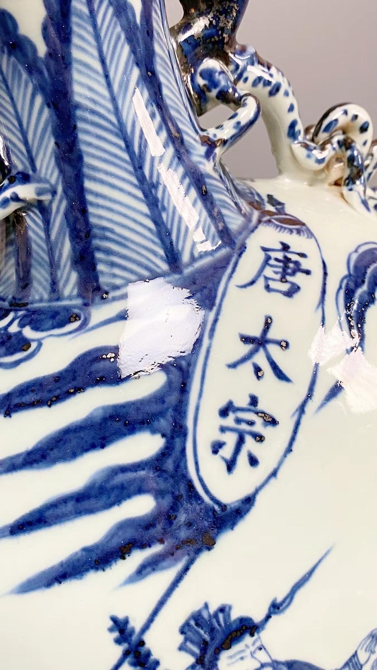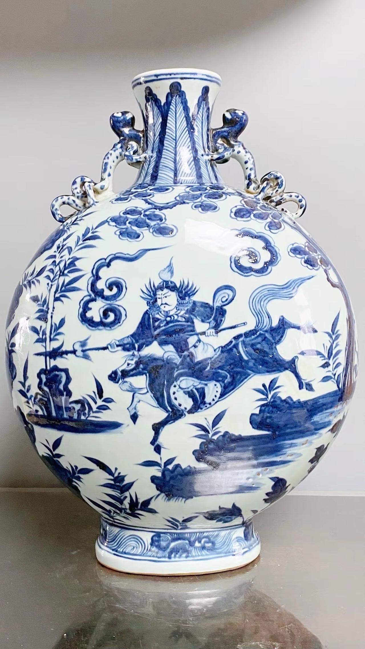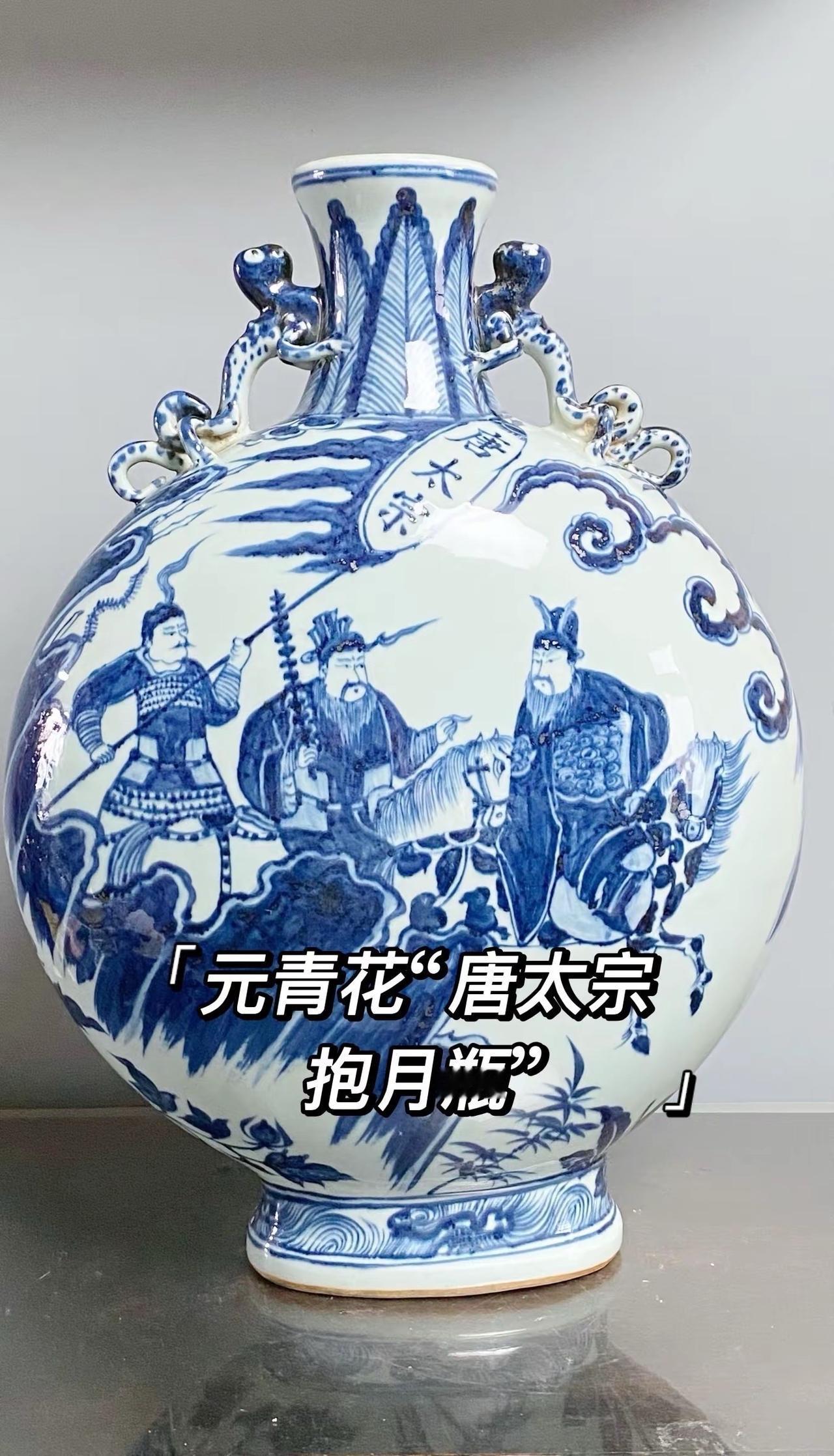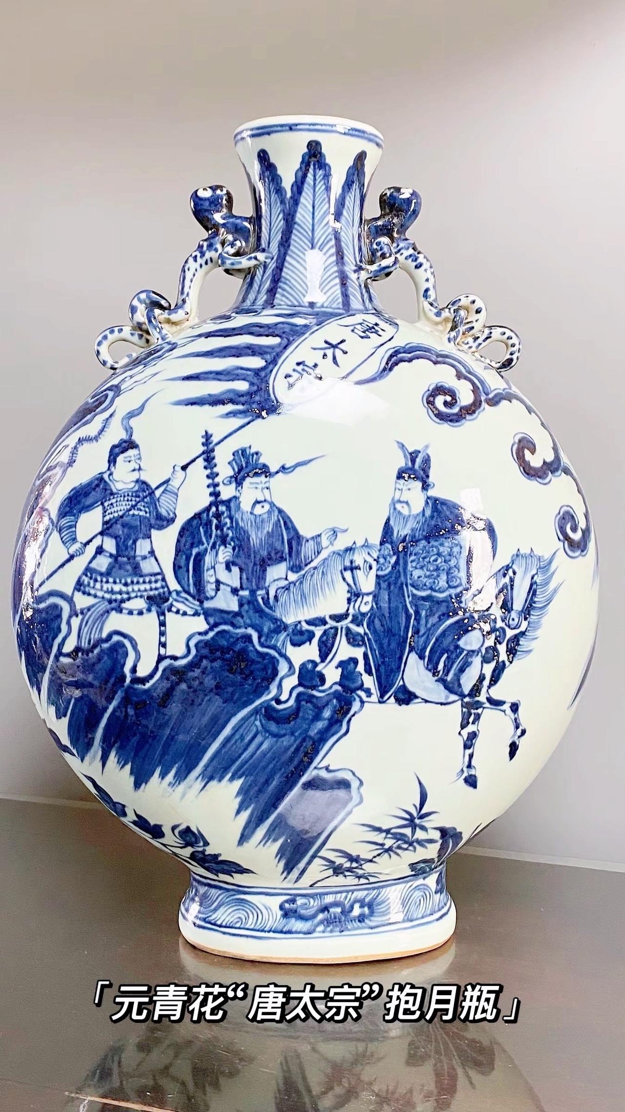 元青花唐太宗螭龙耳抱月瓶收藏,苏麻离青进口料发色非常漂亮蓝中泛紫,此件器物器型硕大画工精美;微观老化痕迹明显,青料特征开门、堪称大开门的元青花精品!元青花 瓷器 古董 收藏