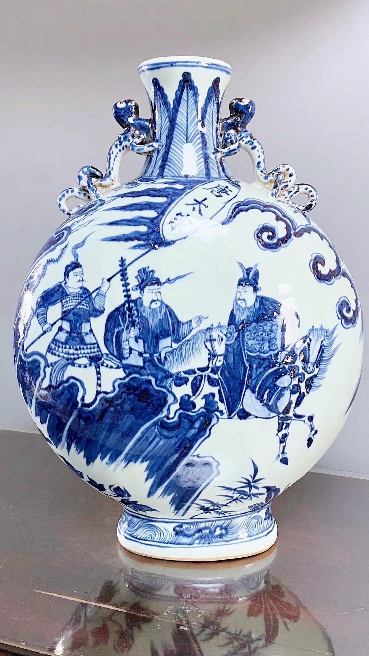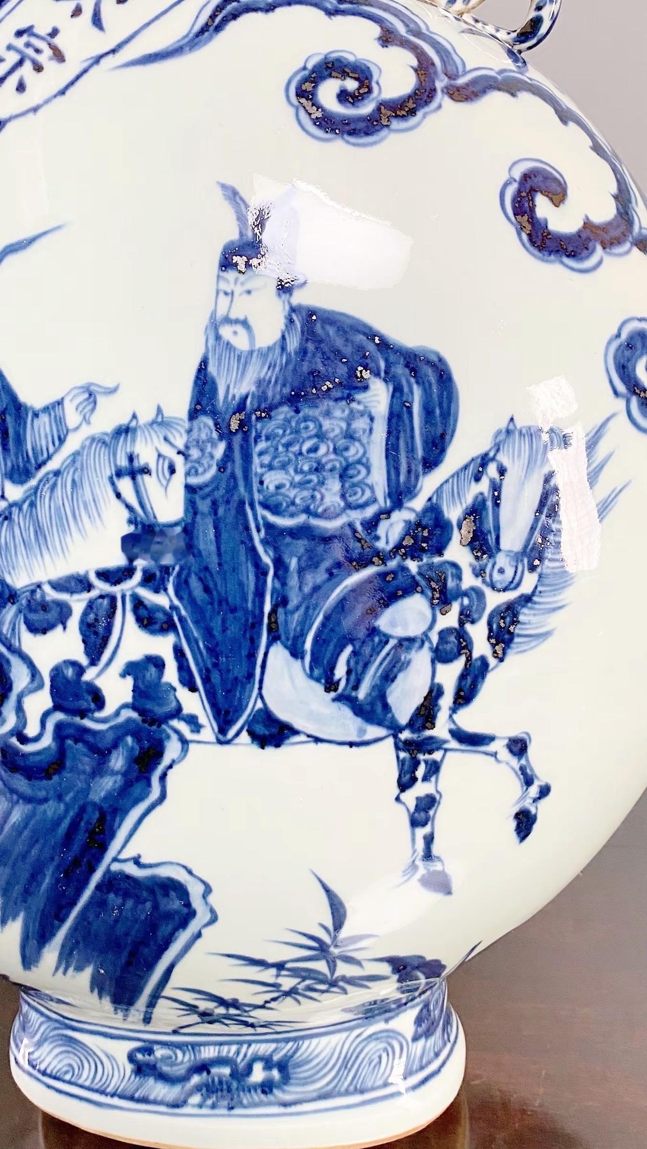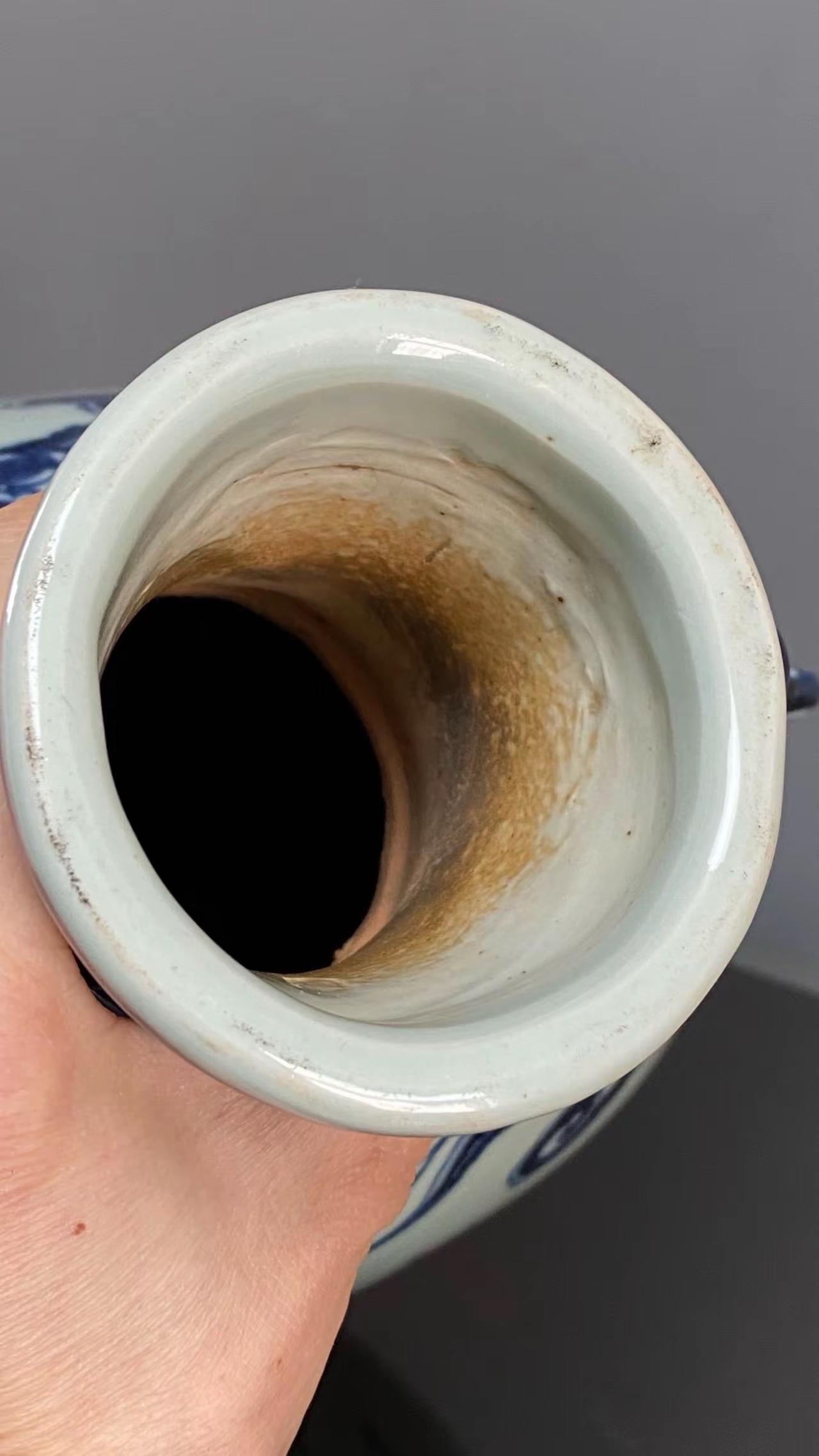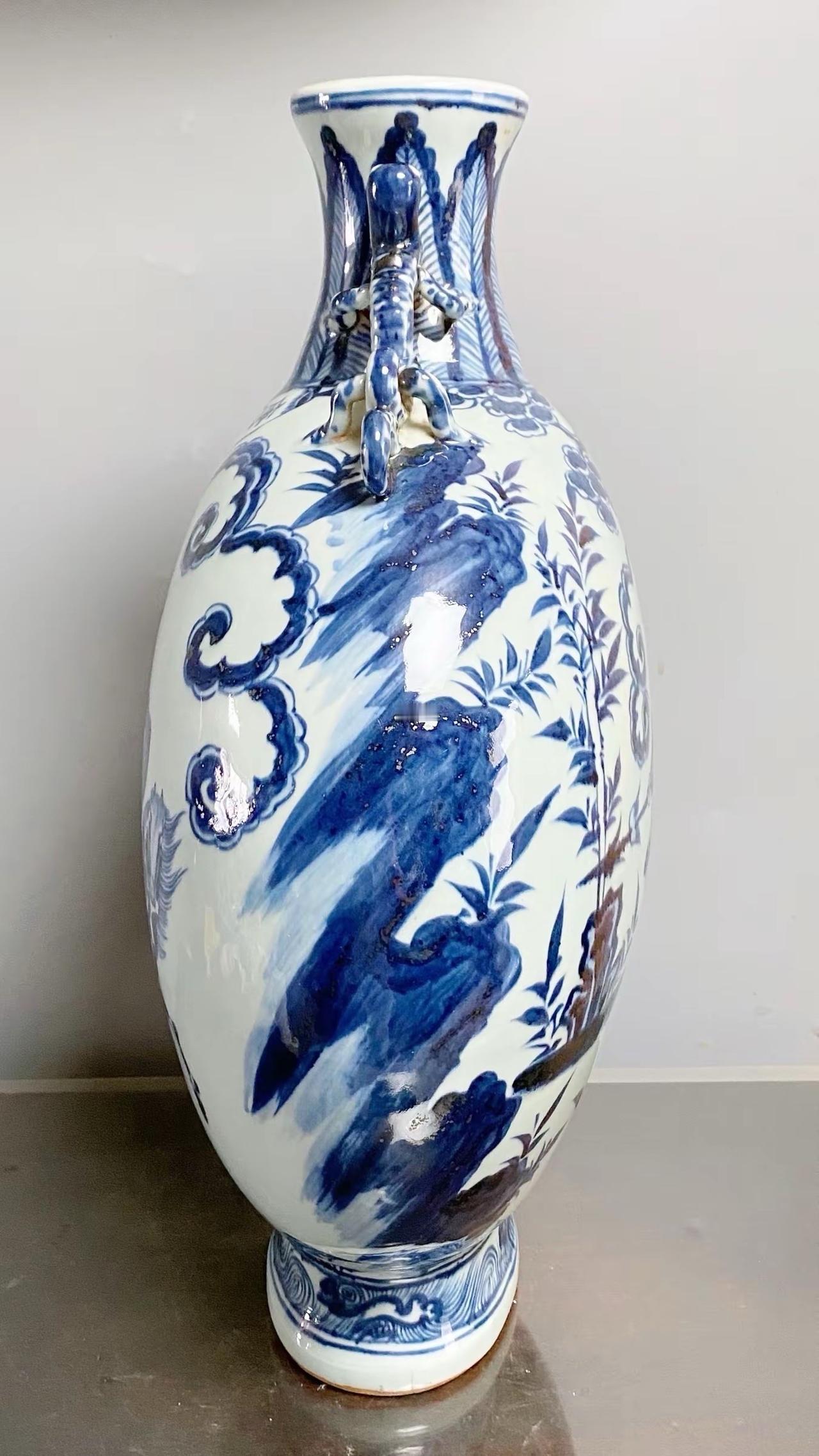 元青花唐太宗螭龙耳抱月瓶收藏,苏麻离青进口料发色非常漂亮蓝中泛紫,此件器物器型硕大画工精美;微观老化痕迹明显,青料特征开门、堪称大开门的元青花精品!元青花 瓷器 古董 收藏