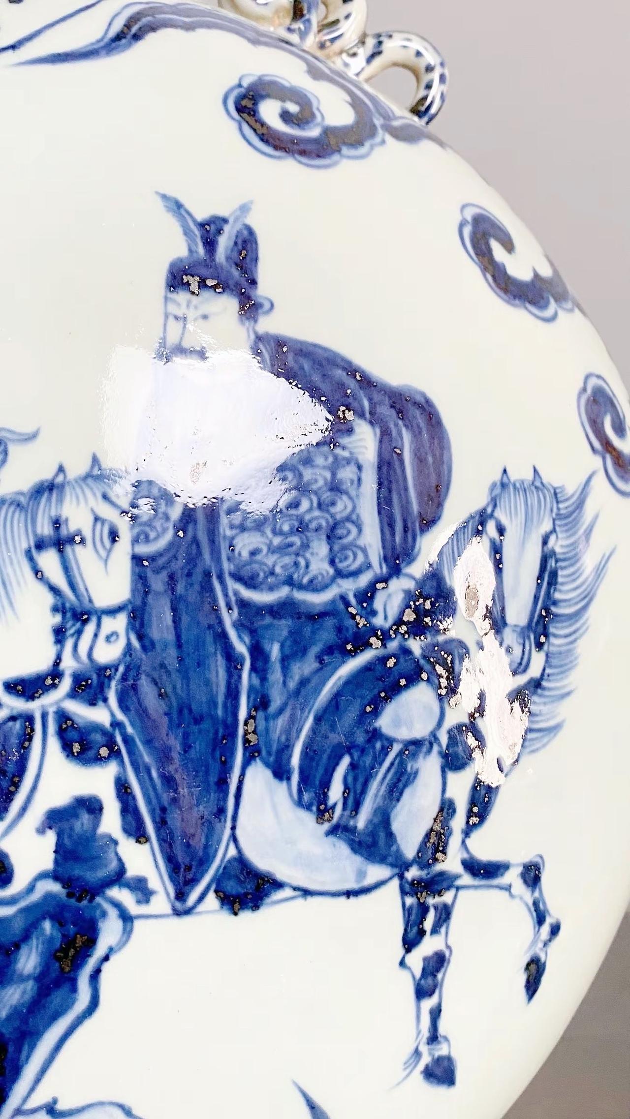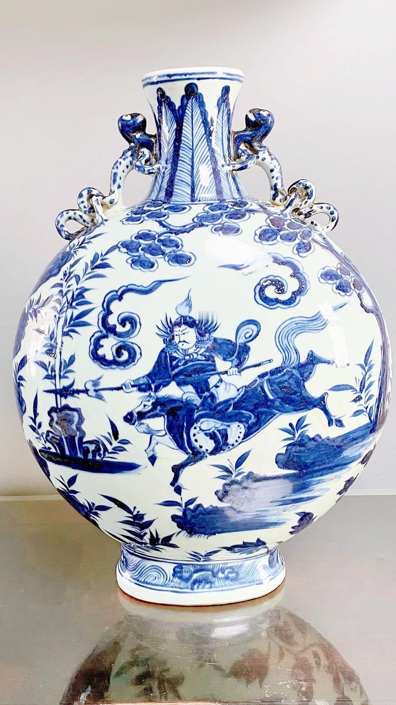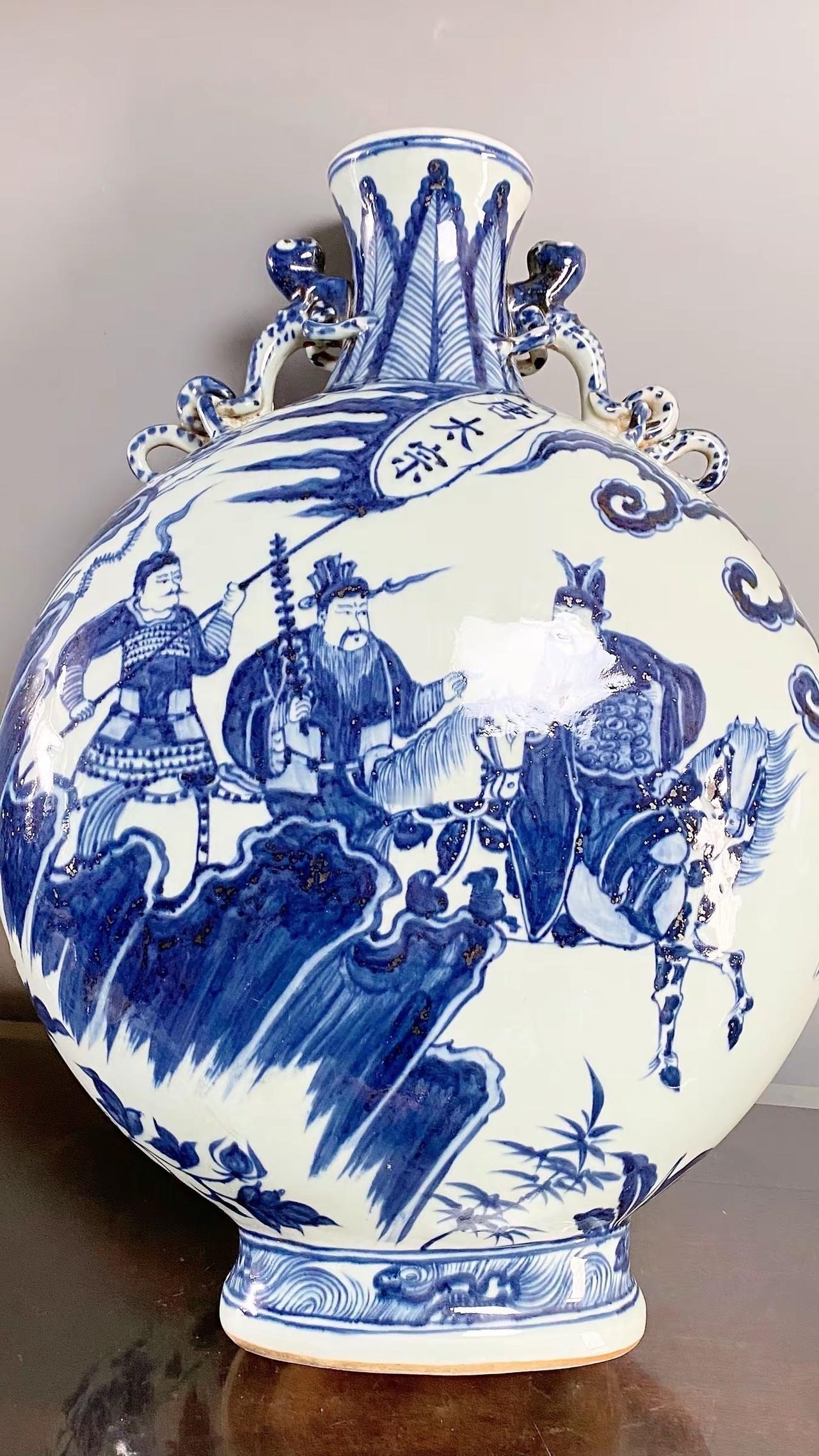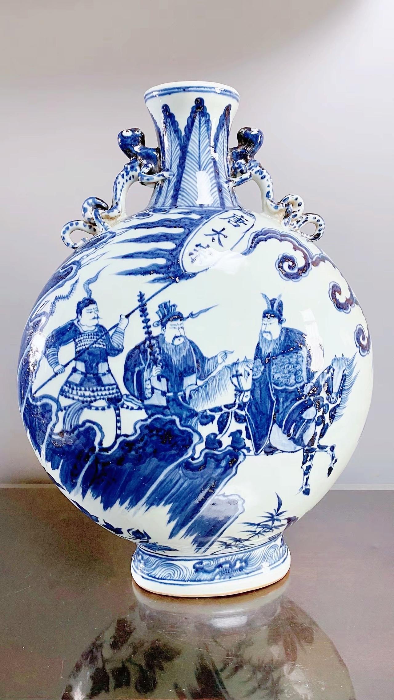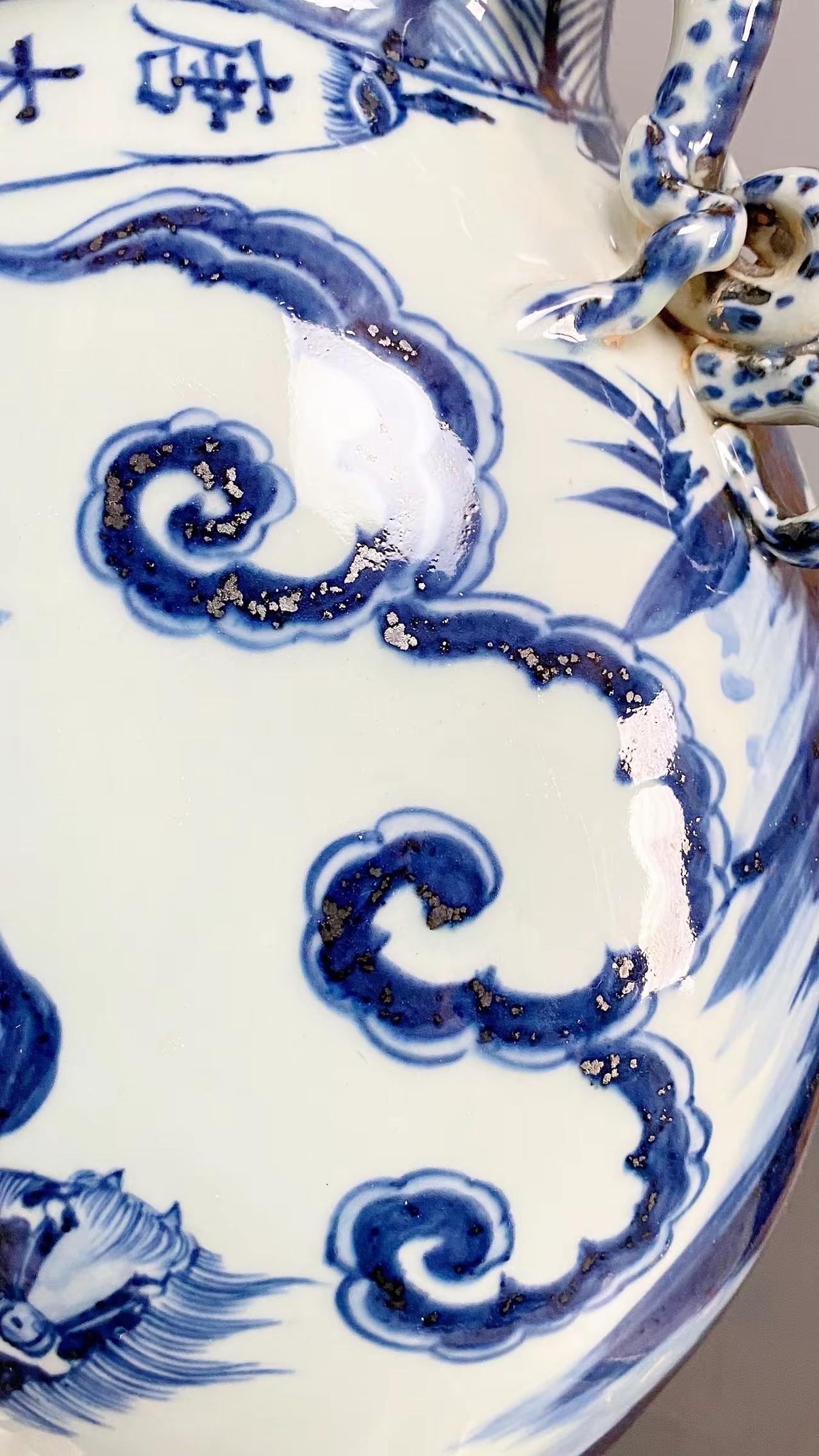 元青花唐太宗螭龙耳抱月瓶收藏,苏麻离青进口料发色非常漂亮蓝中泛紫,此件器物器型硕大画工精美;微观老化痕迹明显,青料特征开门、堪称大开门的元青花精品!元青花 瓷器 古董 收藏