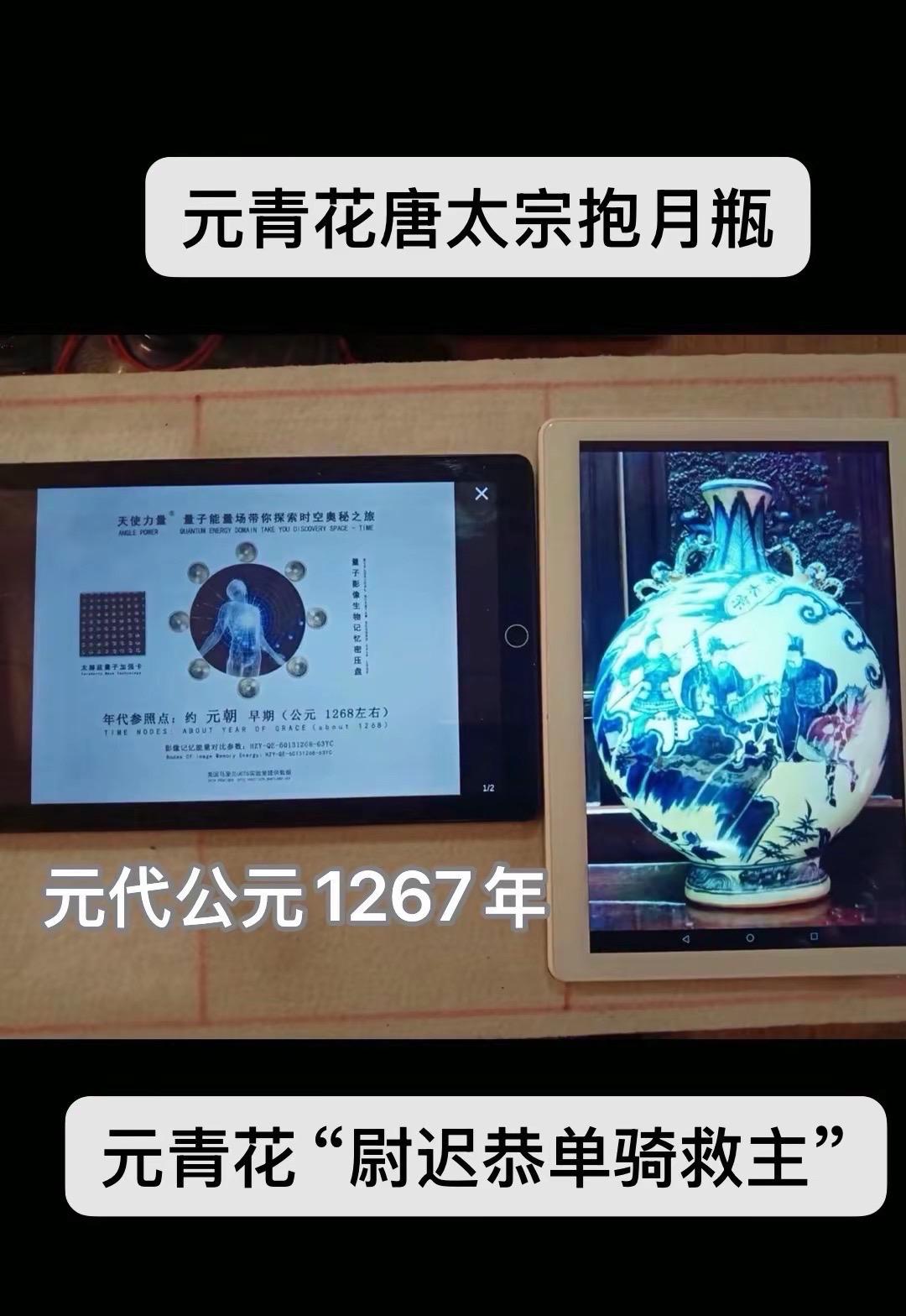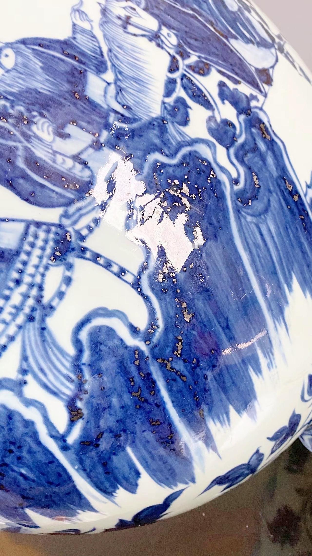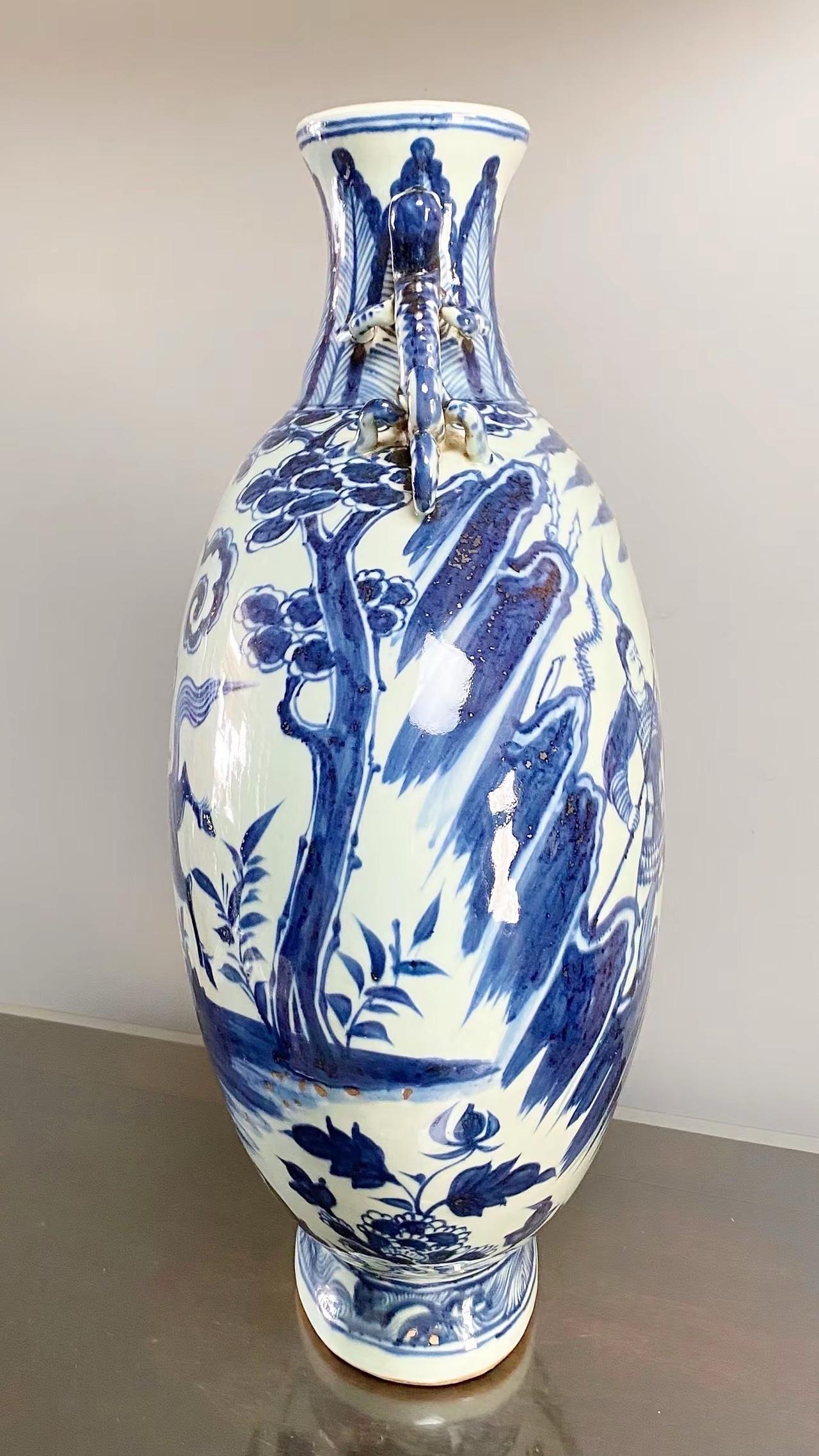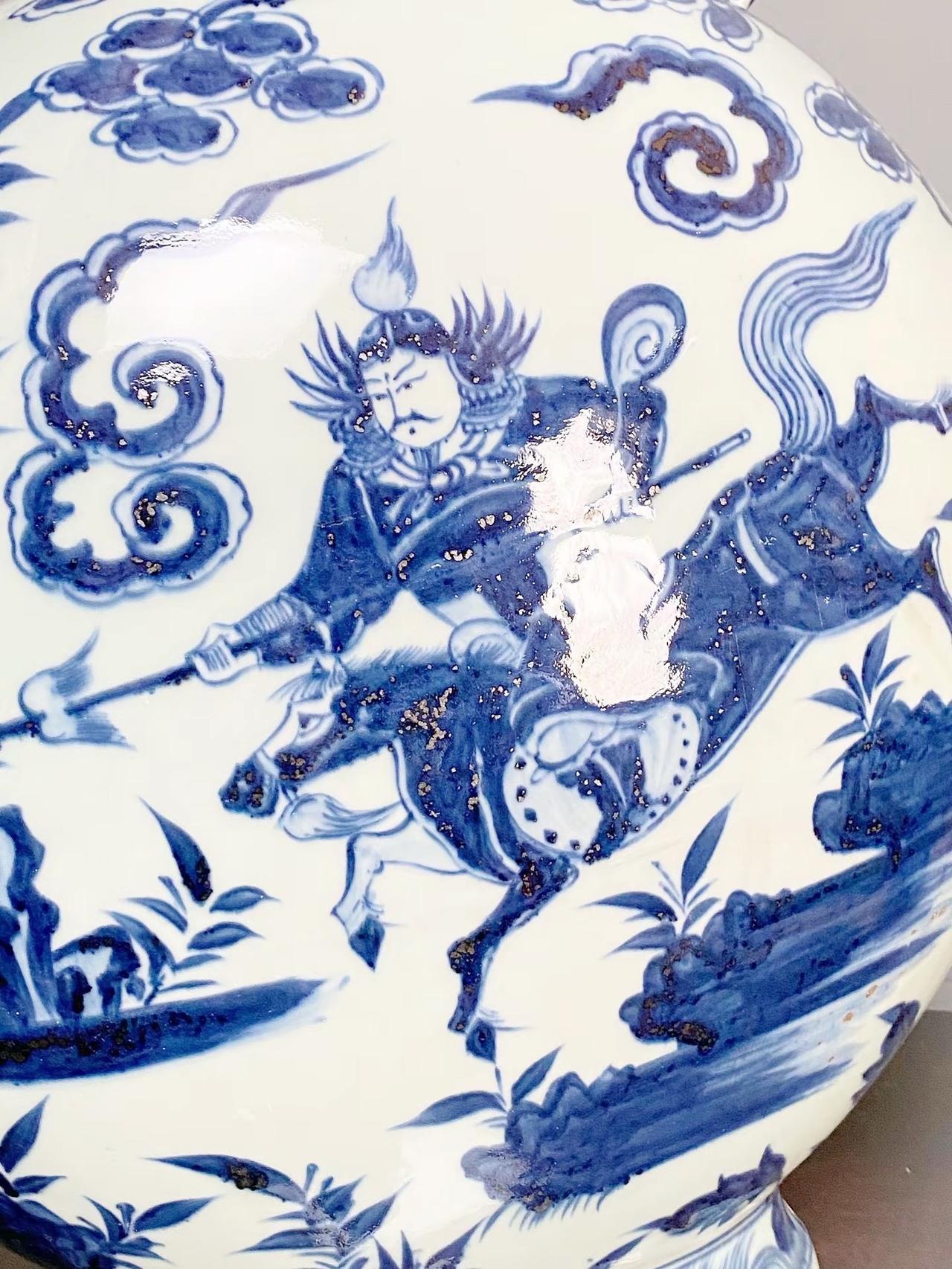 元青花唐太宗螭龙耳抱月瓶收藏,苏麻离青进口料发色非常漂亮蓝中泛紫,此件器物器型硕大画工精美;微观老化痕迹明显,青料特征开门、堪称大开门的元青花精品!元青花 瓷器 古董 收藏