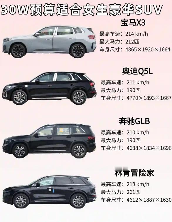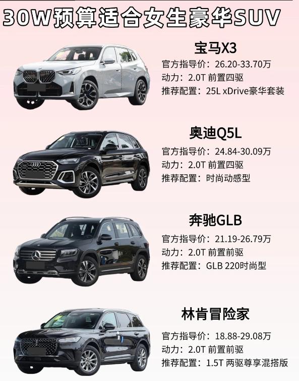 宝子们集合!30W预算想入手一台豪华SUV,既要颜值在线、好开好停,又要兼顾质感与实用性?今天整理4款热门豪华SUV——宝马X3、奥迪Q5L、奔驰GLB、林肯冒险家,从外观、内饰、续航三大核心维度,拆解优缺点,精准适配女生用车需求,看完再也不纠结👇