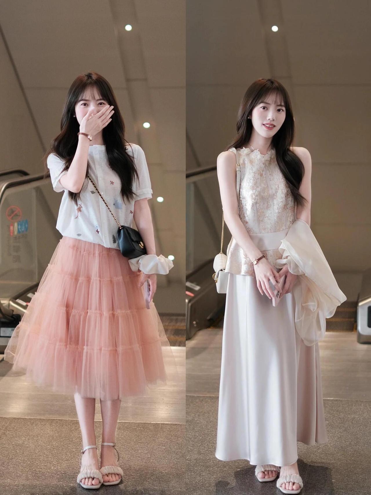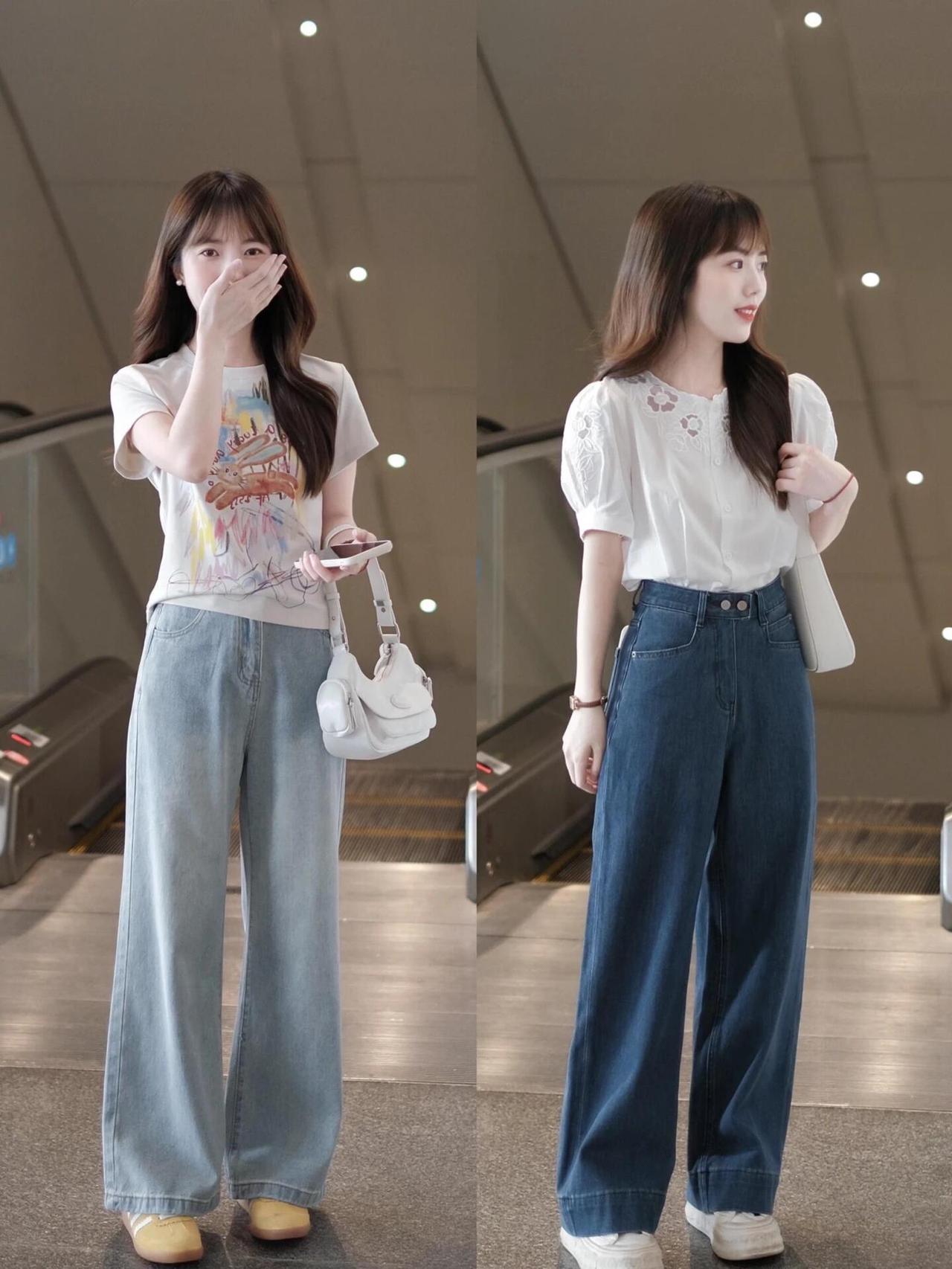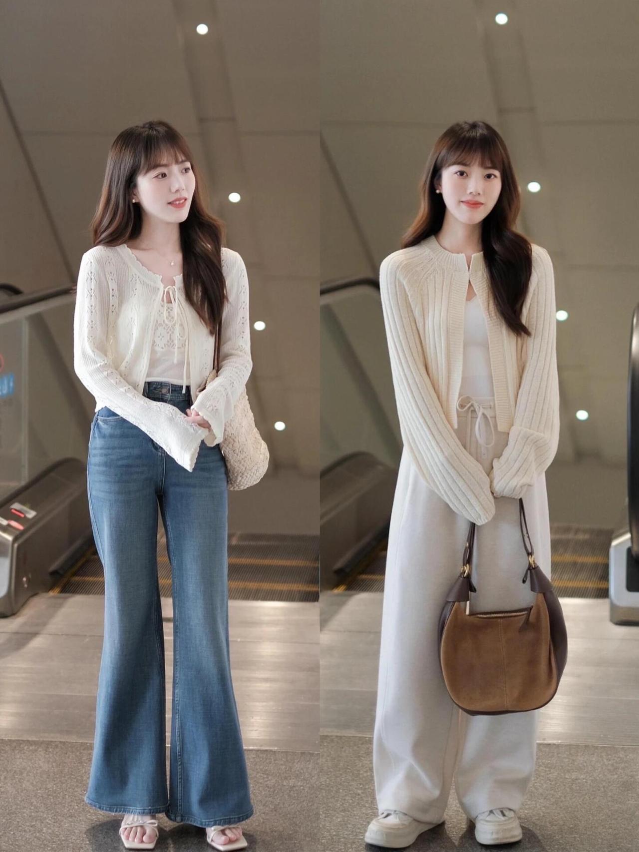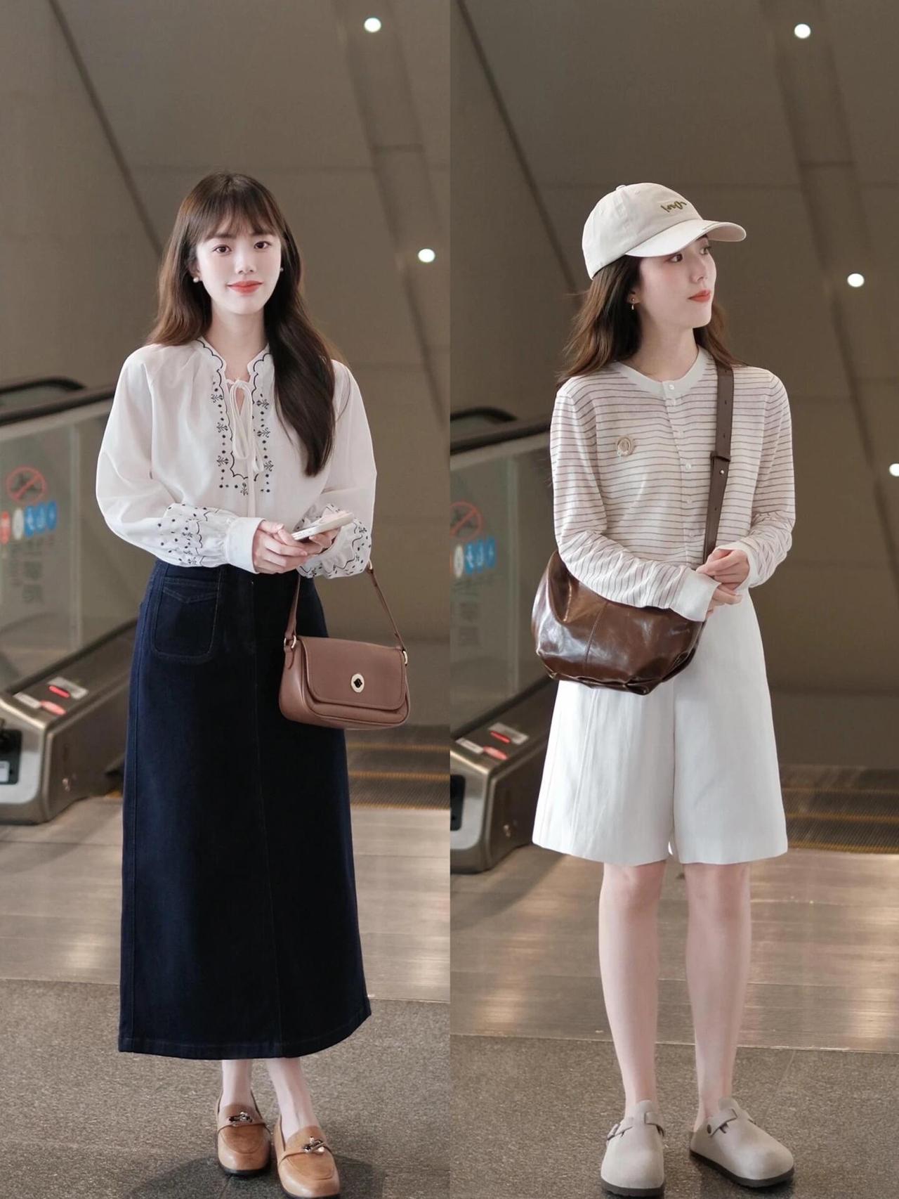 她用短款蕾丝衫+同色系半裙打造高腰线,白衬衫+高腰西装短裤利落又显腿长;或是用针织开衫+直筒牛仔裤、印花T恤+阔腿裤拉长比例,配色清新柔和,搭配浅口鞋和精致包包,整套look温柔又显气质,轻松穿出高挑轻盈感。