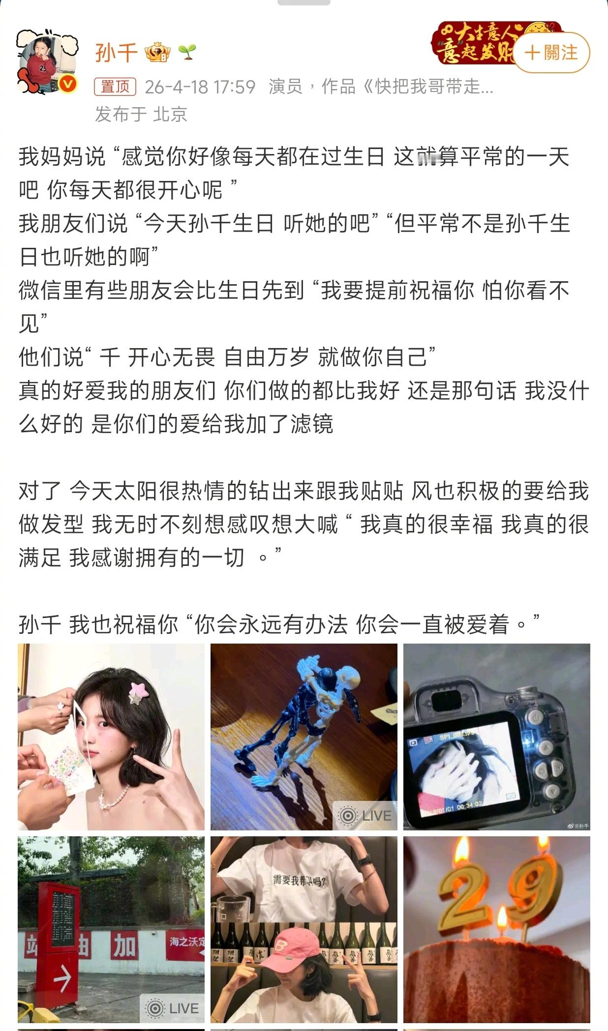 孙千的文字和樱花树一样衬人孙千的文字真的一直都好有温暖好有力量~让人能从文字里能感受到她鲜活的生命力与独特的个人魅力!祝生日快乐一直被爱