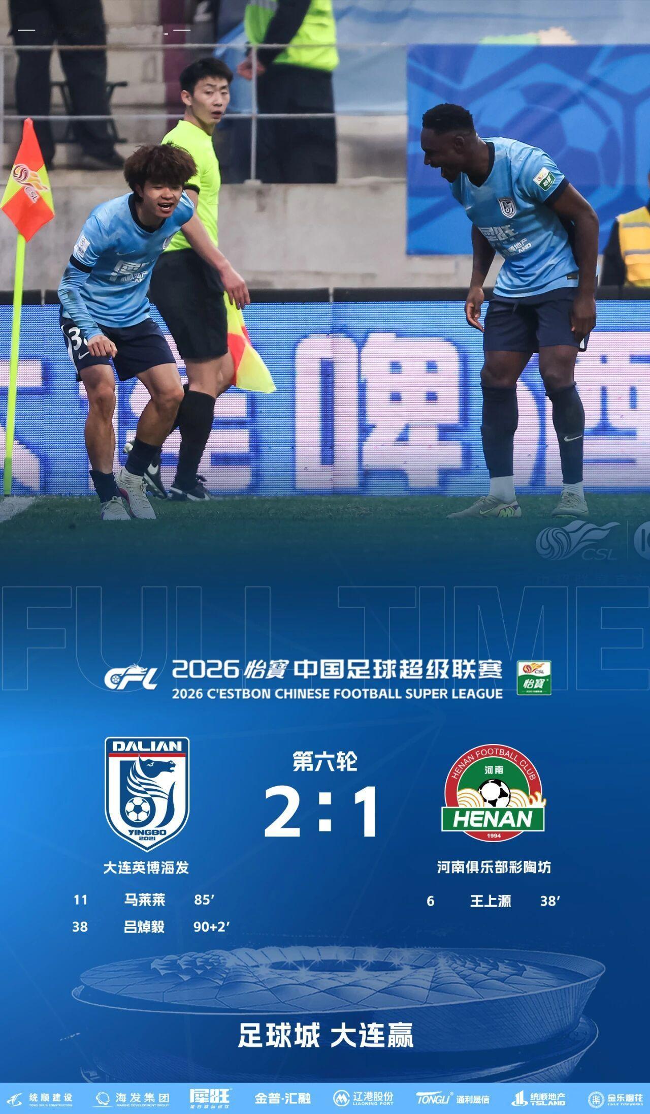 最终,凭借着马莱莱、吕焯毅的进球,大连英博海发队2-1战胜河南俱乐部彩陶坊队,迎来联赛四连胜!大连英博大连英博