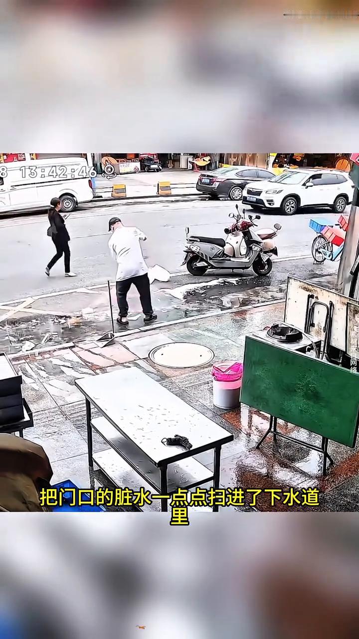 可面对这赤裸裸的刁难,这位老板非但没有当场翻脸,以牙还牙,反而默默拿起扫把,一声不吭的把门口的脏水一点点扫进了下水道里。更让人没想到的是,就在老板低头清理的功夫,隔壁老板居然再次端来脏水,又一次泼在了他刚清理过的店门口。