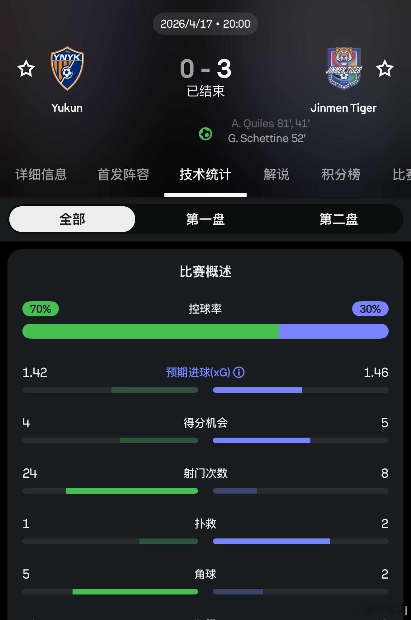 本轮还有一场比赛(图三),津门虎客场对云南玉昆的比赛,比分是津门虎 3 比 0 完胜。但事实上这场比赛射门次数玉昆 24 次是津门虎的 3 倍,预期进球 XG 双方1.42 和 1.46 相差也不大,控球率就更不用说了。但津门虎利用了几次反击和对手后场失误,最终打出了 3 比 0 这样的高比分胜利。