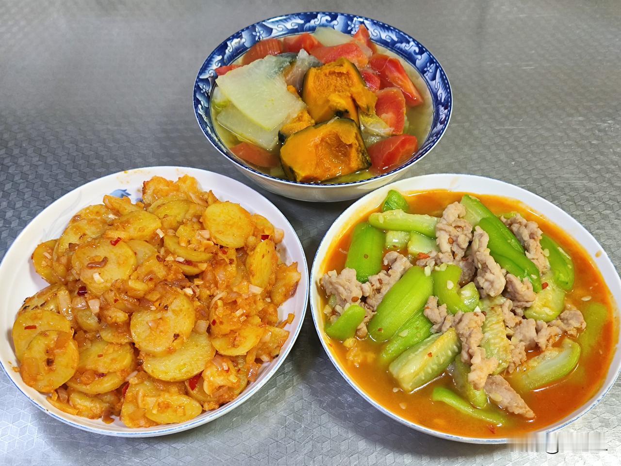 四月十八日午餐分享来啦!有丝瓜烧肉,营养又美味;有回锅土豆片,爽口又好吃;有蔬菜